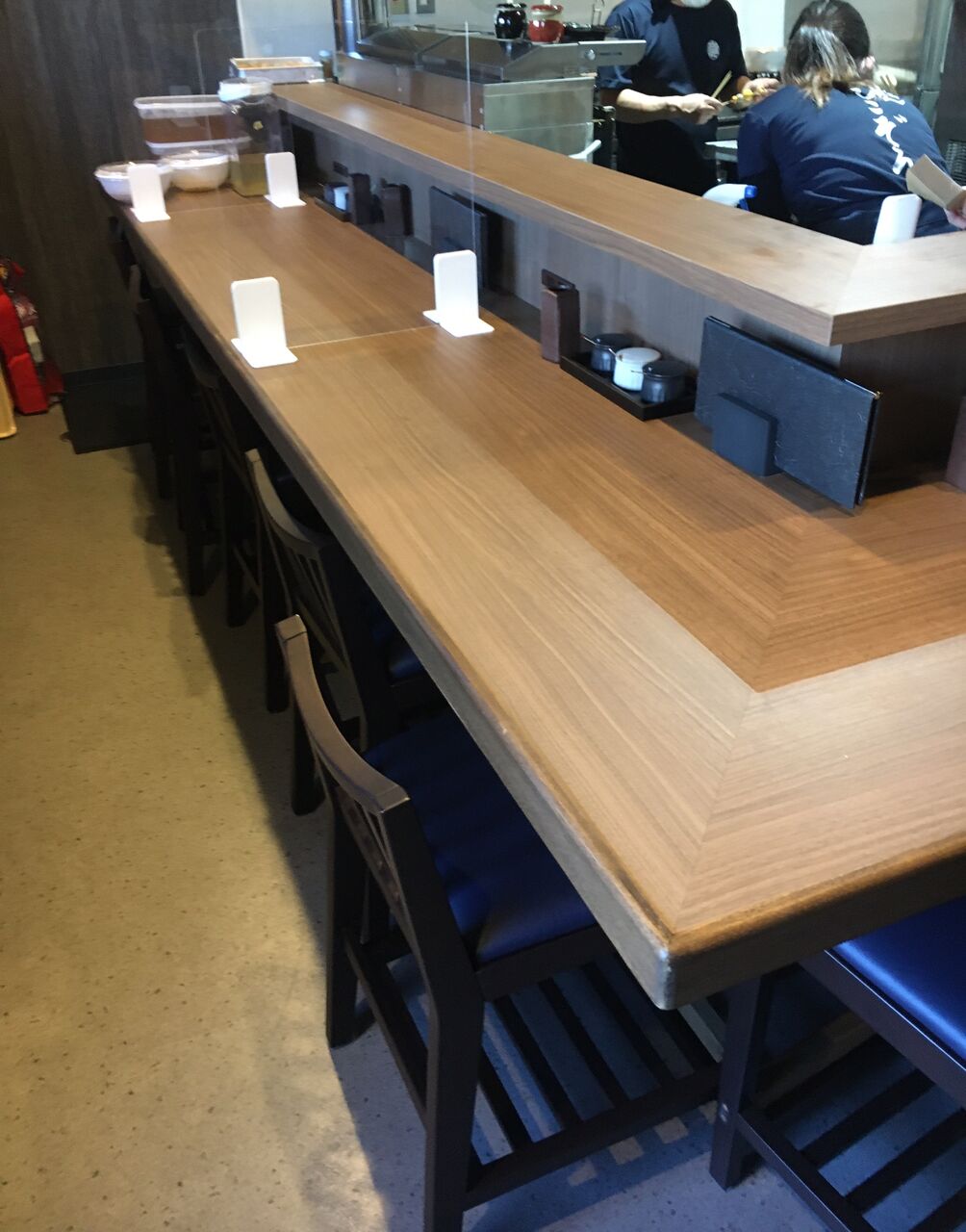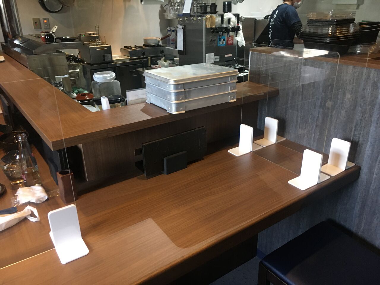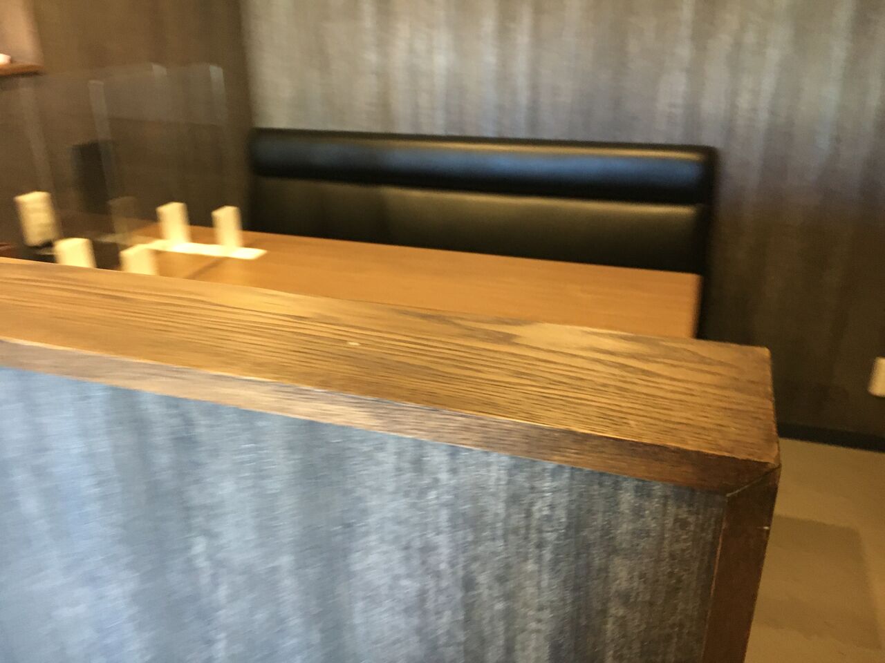 グレーを基調とした、こじんまりとして落ち着いた雰囲気の店内には、カウンター席とボックス席1席があります。カウンター席には、アクリル板がおいてあり、コロナ感染予防対策もしっかりとされていました。