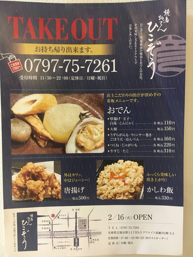 2月16日に阪急逆瀬川駅から徒歩5分、タイムズアピアきた第3駐車場の向かいに「焼鳥 おでん ひこぞう」さんがオープンしました。以前は、「マリーズローカーボフーズ」さんがあった場所です。