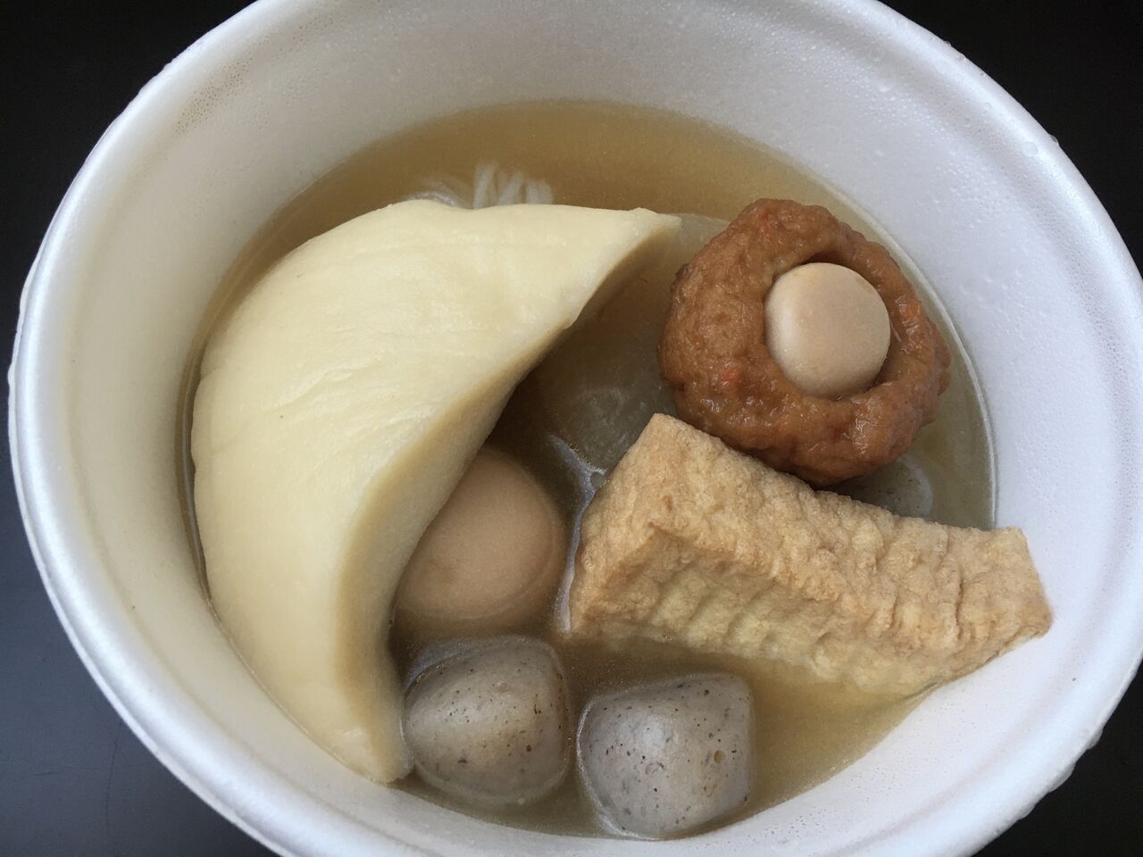 写真は、厚揚げ・玉子・白滝・こんにゃく・大根・うずらがんも・はんぺんです。(各税込110円~)