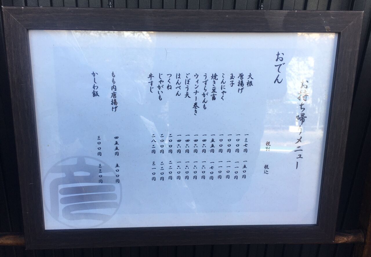 今の自粛期間にうれしい、お持ち帰りでの販売もしています。テイクアウトメニューは、おでん・唐揚げ・かしわ飯の3種類。贅沢に3種類とも注文してみました!
