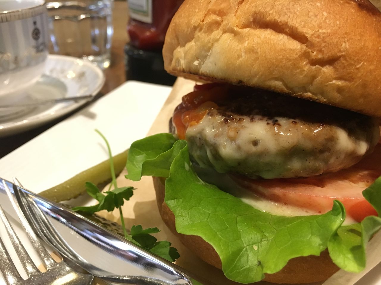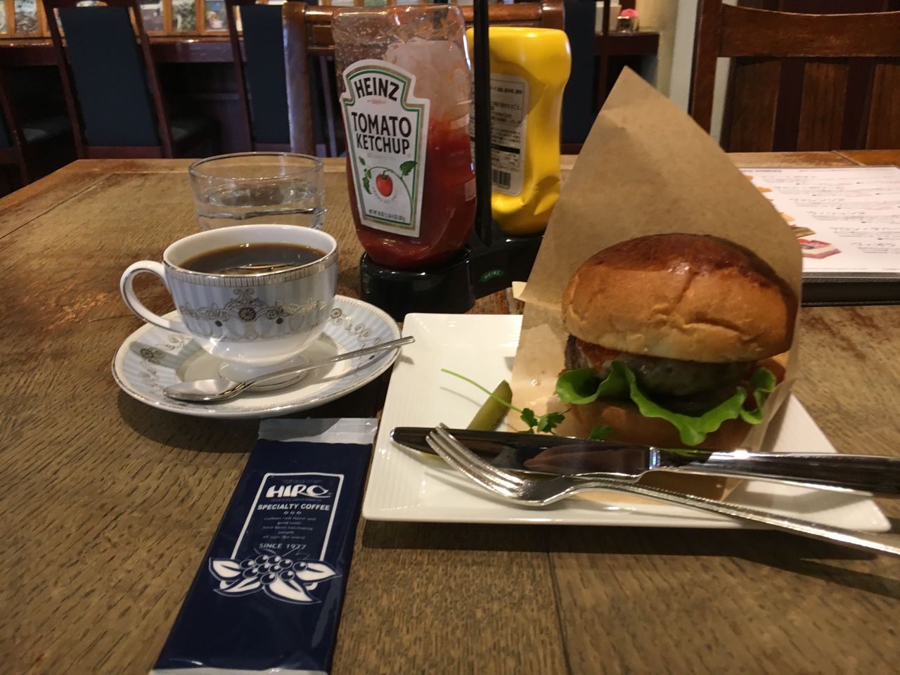 作業場所の確保の為、HIRO珈琲へ入店。時間的にランチの時間でハンバーガーセットを頂いた。今回は、直営の石窯パン工房麦蔵(むぎくら)の特製バンズ使用のハンバーガー、麦蔵チーズイン・バーガーを注文。縦にボリュームのあるハンバーガーで、ナイフとフォークの存在に違和感を感じならかぶりつくと、ハンバーグの中にチーズが熱っ!かなり熱かったがヤケドは免れ、セーフ。ナイフとフォークの存在がその時ようやく理解できた。胃袋の大きい人なら、この他にもなにか食べたくなる大きさだ。