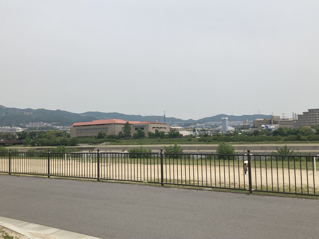 武庫川が望める広々とした広場に、樹木やベンチが設置されていました。