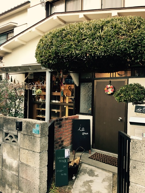 阪急逆瀬川駅から徒歩5分ほど、宝塚市立宝塚第一小学校手前の住宅地にハンドメイド雑貨の店”ie-イエ”がある。一見普通のお家にみえるが、よく見ると「ie open」の看板発見。