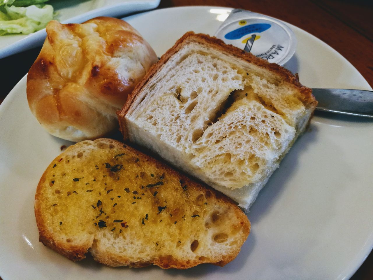 パンはロールパン、紅茶のデニッシュブレッド、ガーリックトーストの3種類でした。