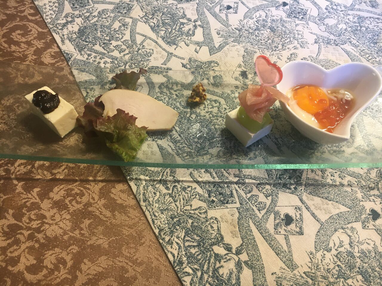 左から、お豆腐・鶏ハム・クリームチーズと生ハム・温泉卵のイクラがけ。どれも素材の味が生かされていておいしい!