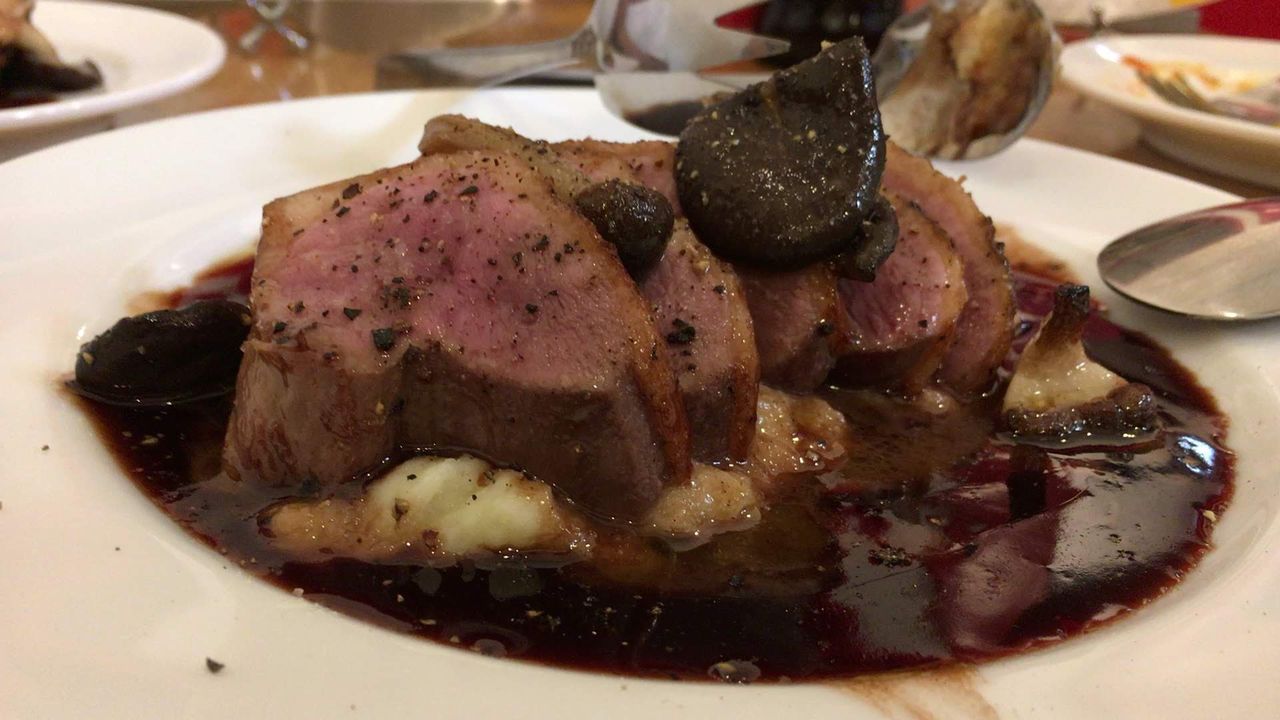 ランチメニューの豚ロース肉のロースト ピッツァ仕立ての丸茄子のグリル和え。ロースト肉、茄子、ソースにピッツアのようにチーズが絡んで、味を引き出している。