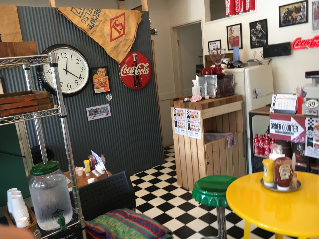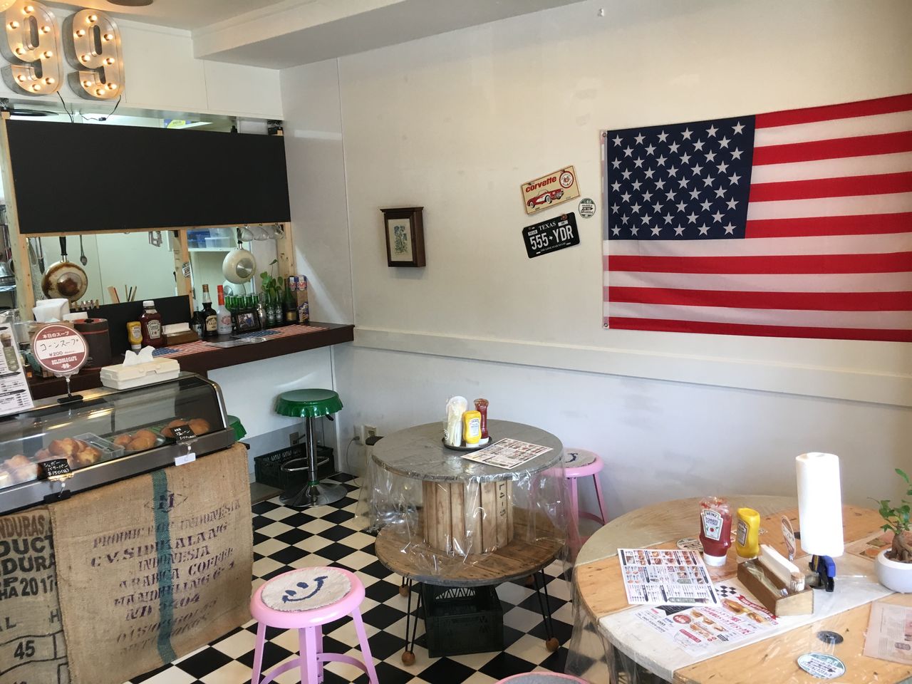 「サバドッグ」等の変わり種のホットドッグも扱うDELIDOG & CAFE -99-。店内はアメリカン調で、オープンしてから一度レイアウトが変わっている。店主のワッキーこと山脇さんの明るい性格が、お客さんを呼び寄せ、常連のお客さんがいつも買いに来る賑わいのあるお店になっている。写真をとった日はたまたま席があいているところを撮影したが、ソファー席など、数人の方がいつもまったりとされている。