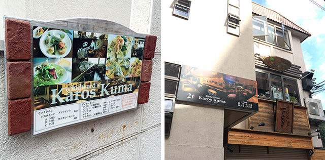 阪急宝塚南口駅から徒歩1分のイタリアンのお店「カロスキューマ」。駅から線路い沿い東側を北方向、武庫川へ向かう道を20m程歩き、左折して20m程のところの右側2階にお店がある。少しわかりにくいが、武庫川沿いにあるので店舗内に入ると宝塚大劇場が望める。