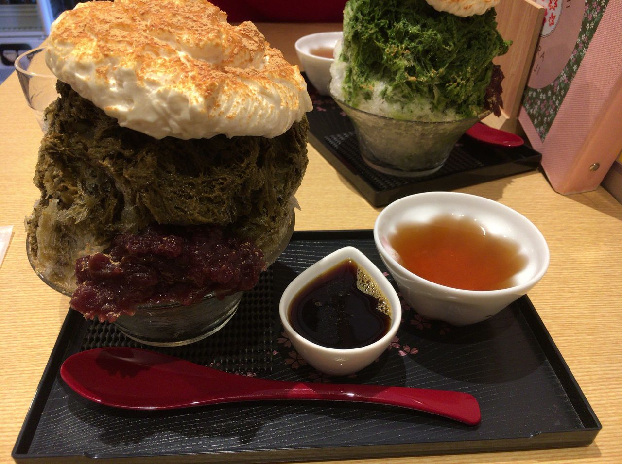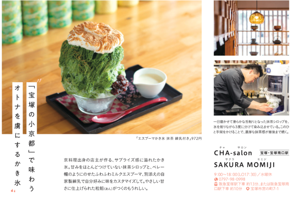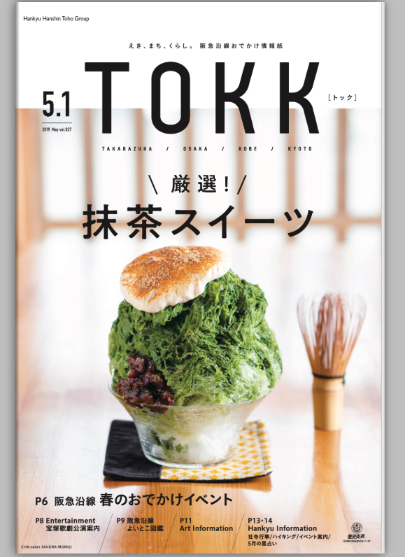 阪急電鉄の情報誌「TOKK」の5月1日号の表紙に選ばれた「さくらもみじのエスプーマかき氷」。まだ、5月だというのに、暑くなりすぎたこの日、「TOKK」の表紙に魅せられ、このお店 “さくらもみじ” にやってきた。早速座った二人は、注文しようとすると、すでに いちごみるく が売り切れという事を告げられ、残る 抹茶・ほうじ茶・みぞれの中から選ぶことに。ここはやはり人気ランクの高い 抹茶とほうじ茶を注文したのであった。