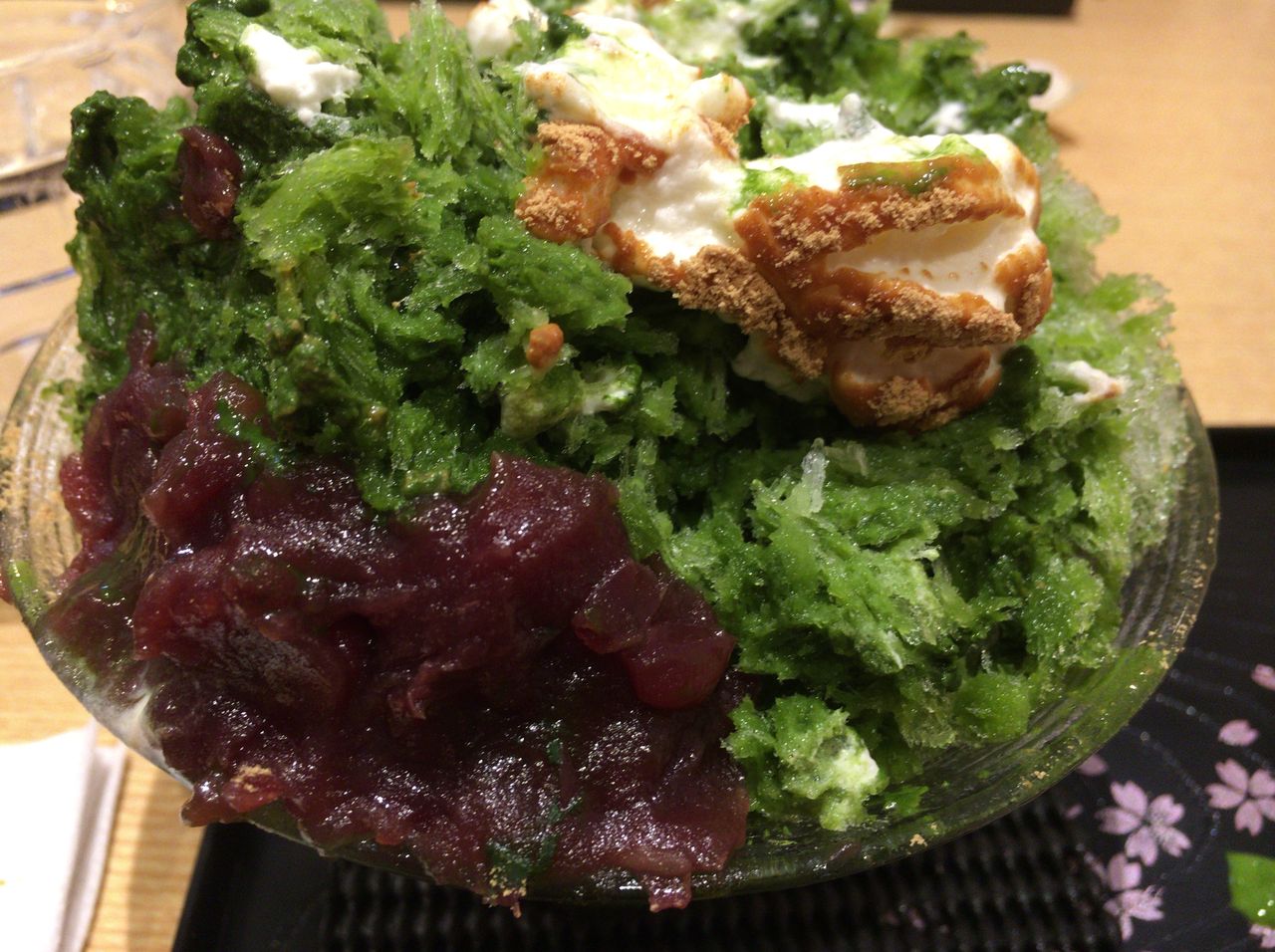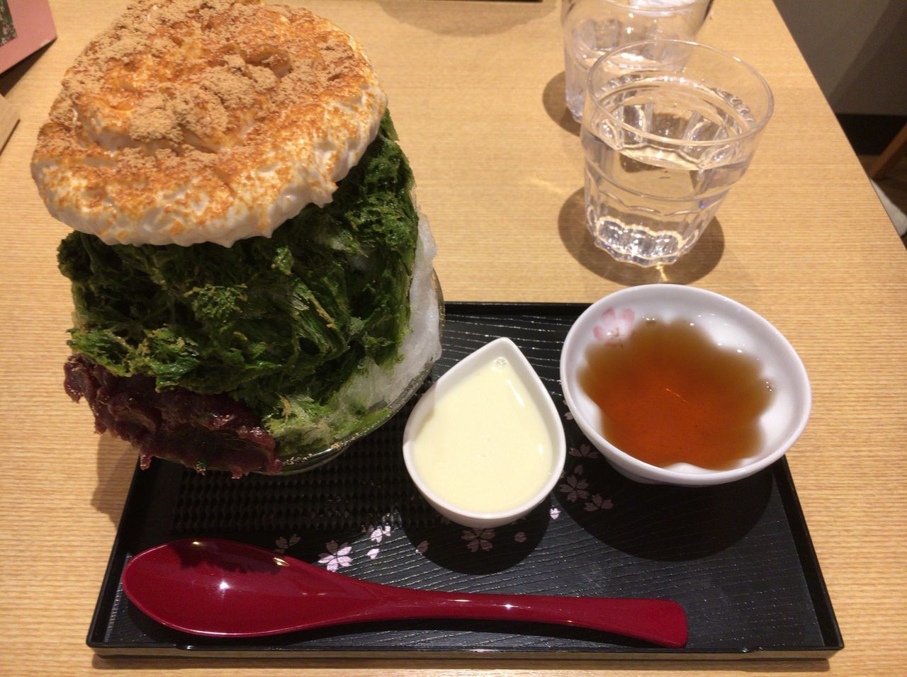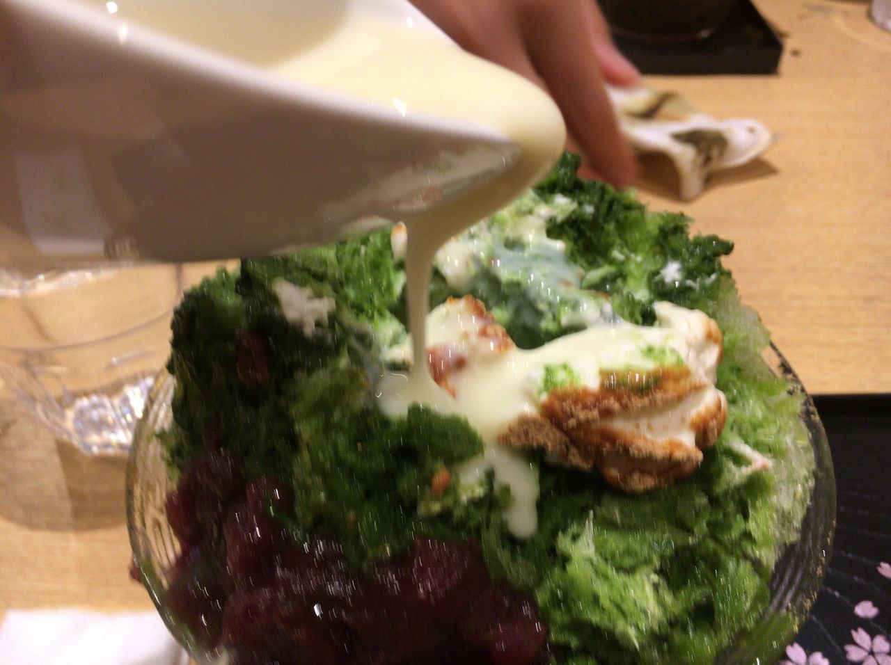 エスプーマミルクと抹茶の氷を堪能しながら食べていくと、ようやく半分あたりだろうか(↑↑↑)、ここで、練乳の登場。抹茶とミルクのコンビネーションがたまらない。ほうじ茶の場合は練乳ではなく黒蜜になっている。どちらも美味。