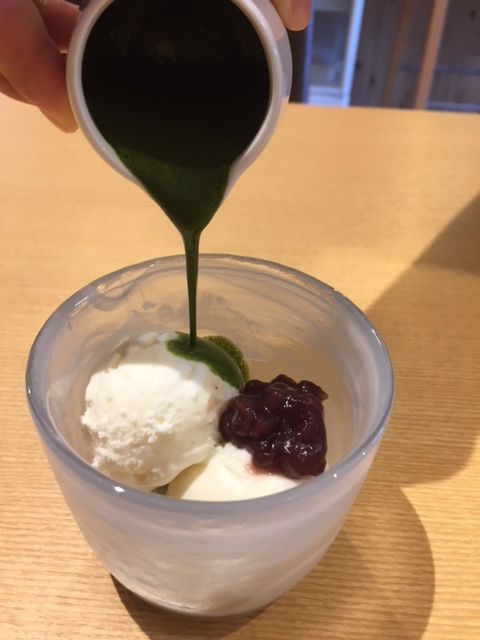 アイスクリームに濃厚な 抹茶ソース/ほうじ茶ソース をかけて食べるというモノ。『美味しい出会いがまるで和風アフォガード』とメニューに記載されている。