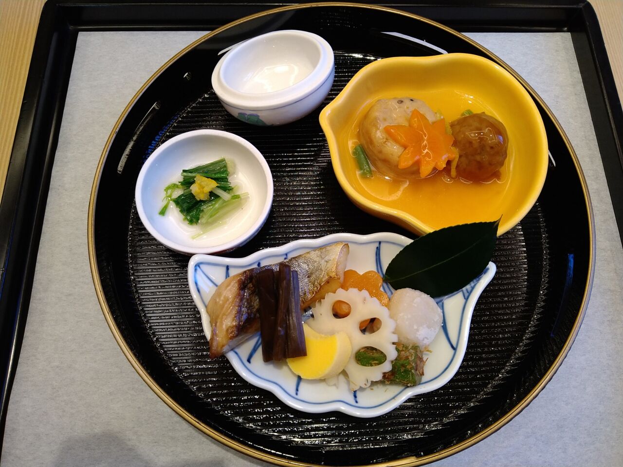 小鉢、焼き魚、あしらい、口取り五種、野菜煮です。