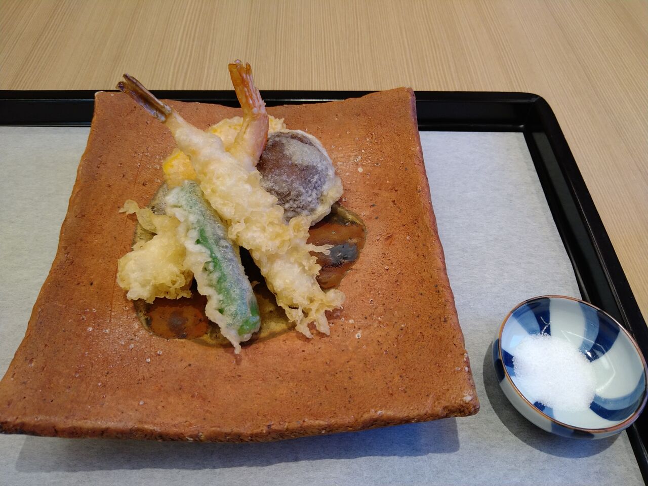 天ぷら(海老・ししとう・椎茸・南瓜)を、お塩で頂きます。