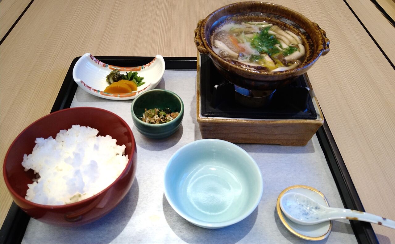 温物(蟹身・茸の小鍋仕立て)と、鮭ちりめん御飯、お漬物です。