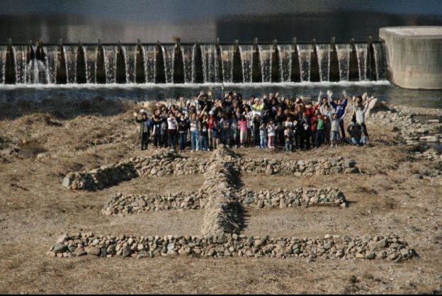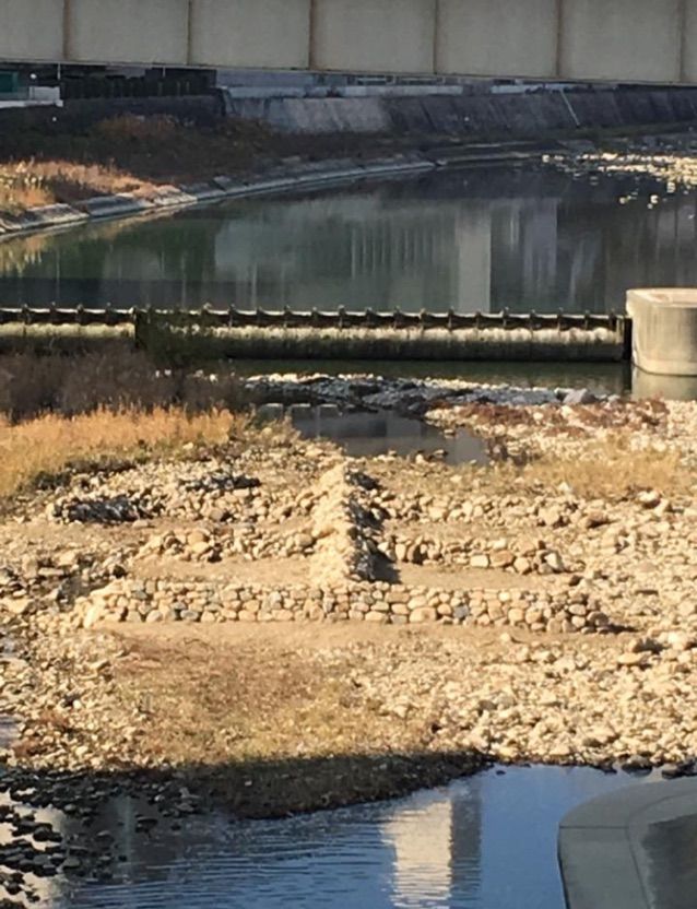 『生』オブジェは、宝塚市在住の現代美術家大野良平さんによって「街と人の心の再生」を願って制作された。台風などで武庫川が増水する度に流失し、市民により再生され現在7代目。そして12月9日、10日に8代目となる「生」を再生する石積みが実施される。