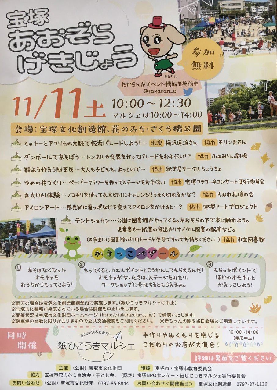 2ヶ月に一度開催される「紙ひこうきマルシェ&あおぞらげきじょう」が11/11(土)前回と同じく宝塚文化創造会館横の公園 “花のみち・さくら公園橋公園” にやってくる。事前に配られているチラシを折って紙ひこうきを制作し、どこまで遠く飛ばせるかを競い合う「紙ひこうき大会」は13:00から行われる。当日、よく飛ぶ紙ひこうき講座もあり。紙ひこうきマルシェでは、美味しいもの、手作り雑貨などの出店、クラフト体験などもあり、大人からこどもが楽しめるイベントなのだ。
