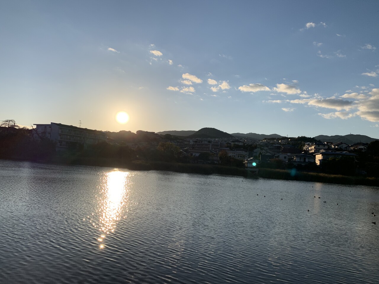 池から見た景色は遠くに山並みが見渡せて、きれいです。