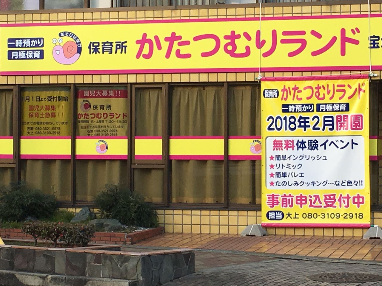 阪急宝塚南口から徒歩4分のところに新しく保育所がオープンする。保育所かたつむりランドは、三田に本社のある株式会社ビッグウエストの経営。これまで、西明石、伊川谷、川西、西宮など、宝塚は5箇所目になる。(http://katatsumuri-land.com/