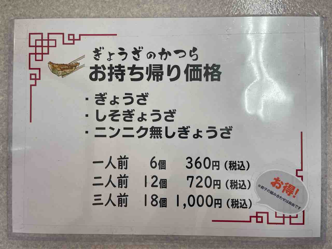 メニューはこちら、しそ入りやニンニク無しもあります。3人前が税込でジャスト1,000円とお得です。