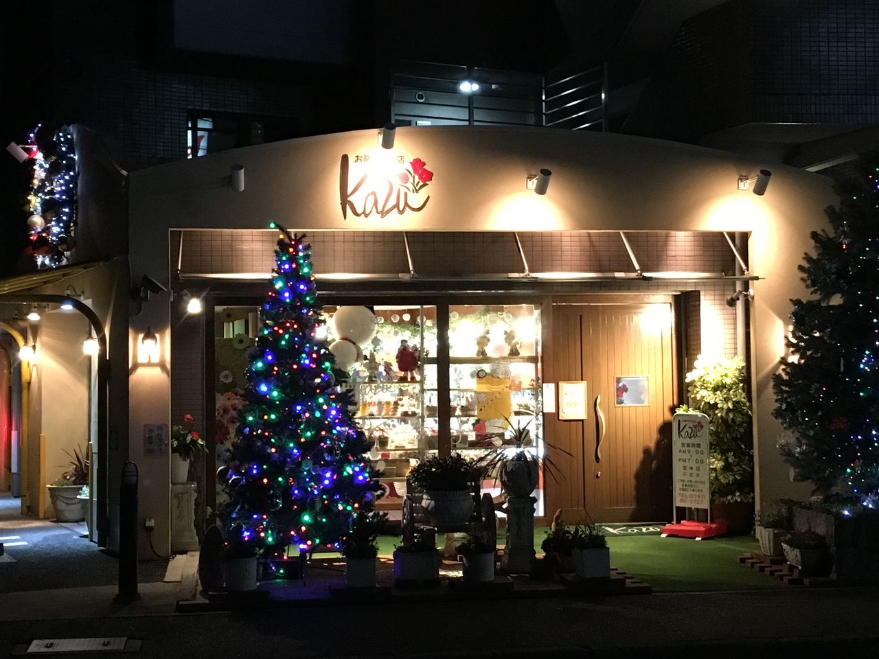 年末に差し掛かり寒さも日に日に厳しくなる夜、JR中山寺駅の南600mほどにある道を通ると素敵なイルミネーションを見つける事ができる。お菓子の店「Kazu」では、クリスマスケーキの予約がハロウィン後早々に始まっており、すでにクリスマスモード全開。立派なクリスマスツリーがイルミネーションと共に綺麗にかざられていた。