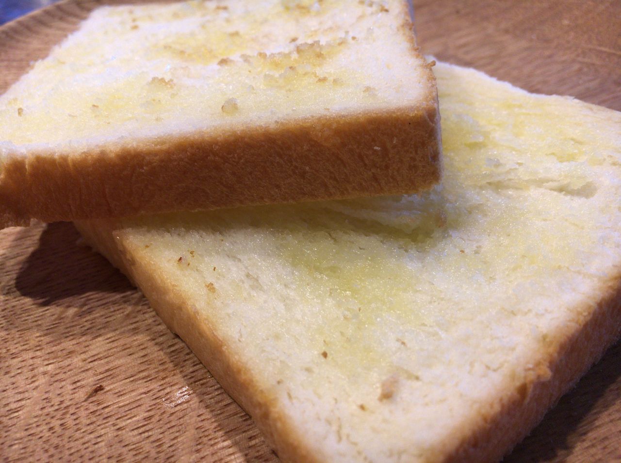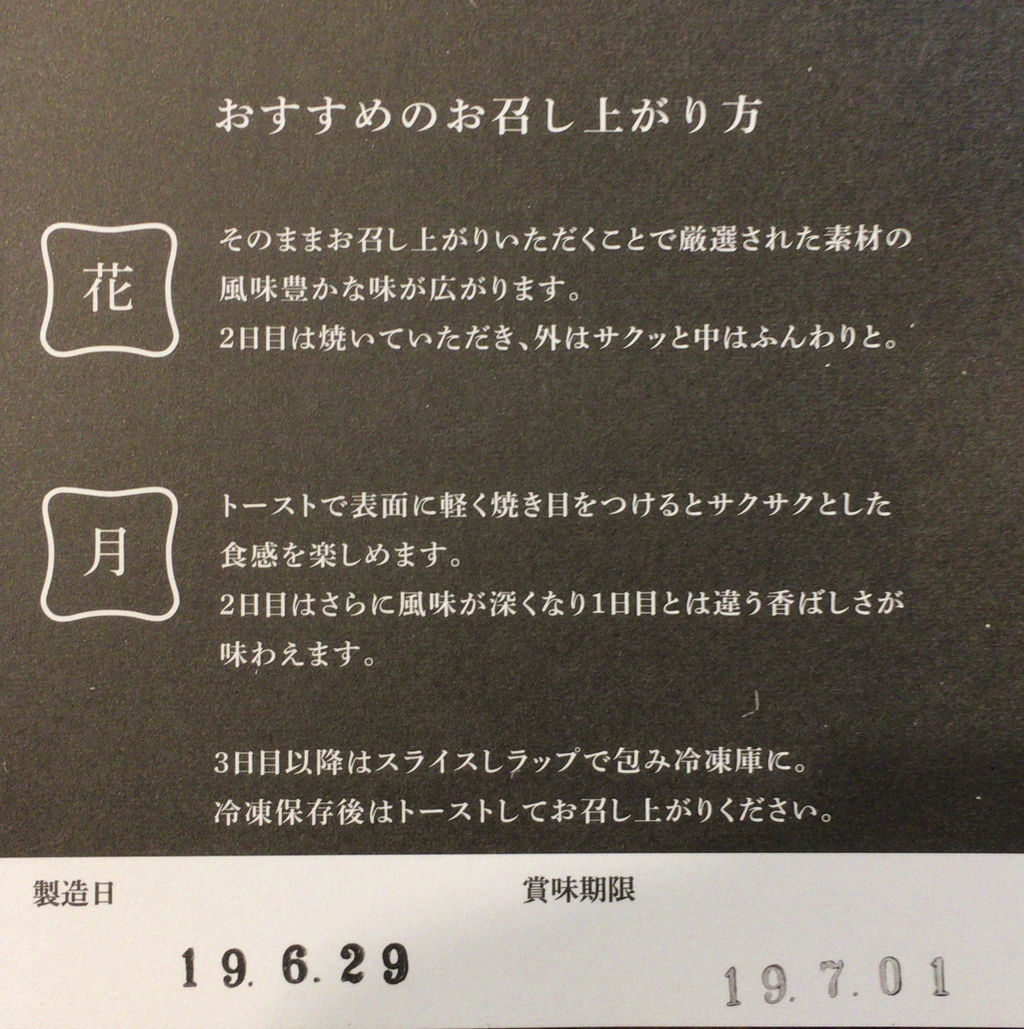早速自宅に帰り、食べてみる。大きさは一般で売られている食パンのサイズより少し小さい。一辺が約10 cm程の大きさ。まずは「花」をスライス。以外と周りが固く中が柔らかいので、包丁では中々切りにくい。言われた通りに焼かずに食べてみた。食感は想像どおりの柔らかさで、味はほんのり甘く、食べたあとも香りが口の中に広がる。たしかに焼かずに1枚たべきってしまう美味しさだ。