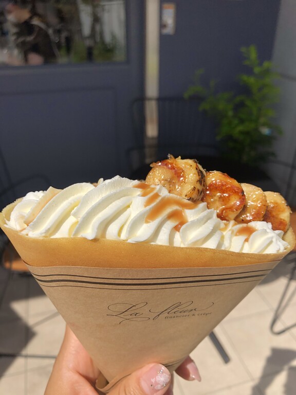 こんがりとキャラメリゼされたバナナとたっぷり入ったホイップ。絶対おいしいやつ!と確信しました。一口いただくと、なめらかで程よい甘さのホイップに感動!ほろ苦いキャラメルとバナナの甘みもマッチしています。