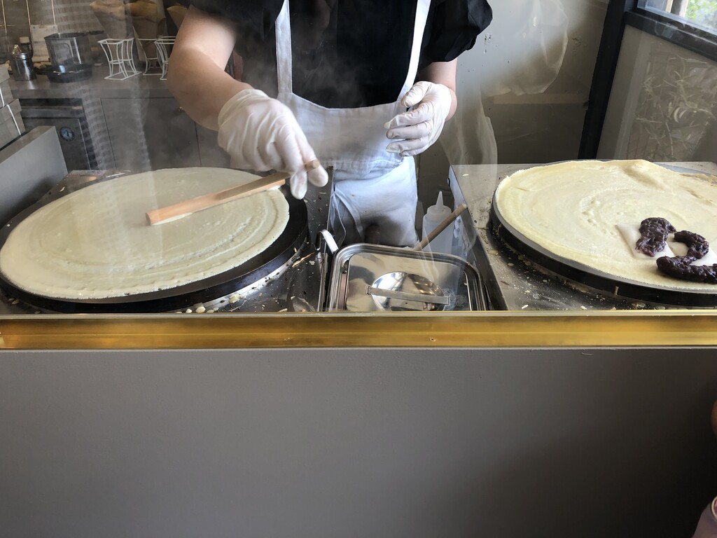 店内へ入ると、まず目に入るのはクレープを焼いている様子。バターの甘い香りもしてきます。クルリと回しながらクレープの生地を伸ばす作業は何度見ても楽しくて視線がくぎづけ!