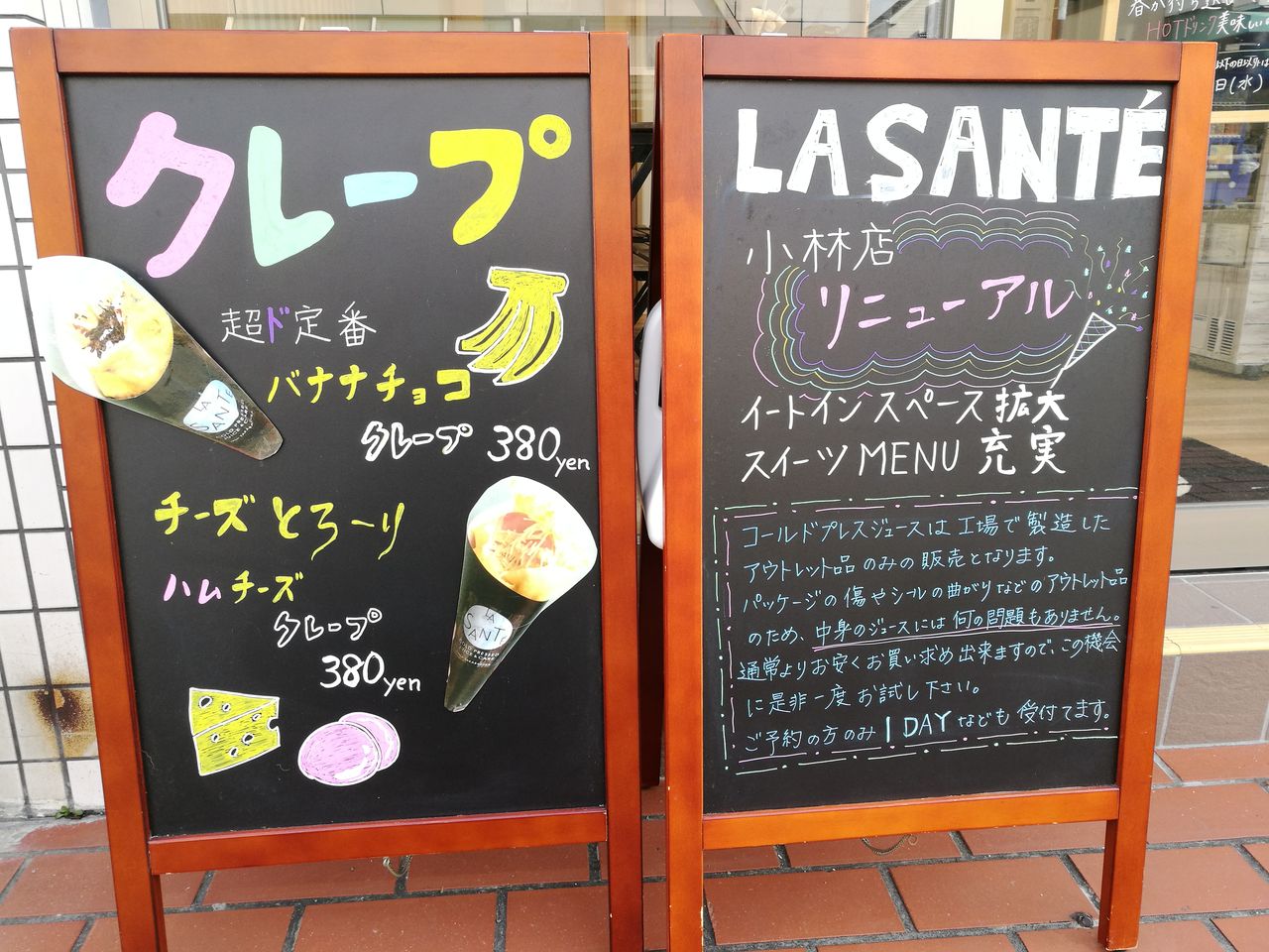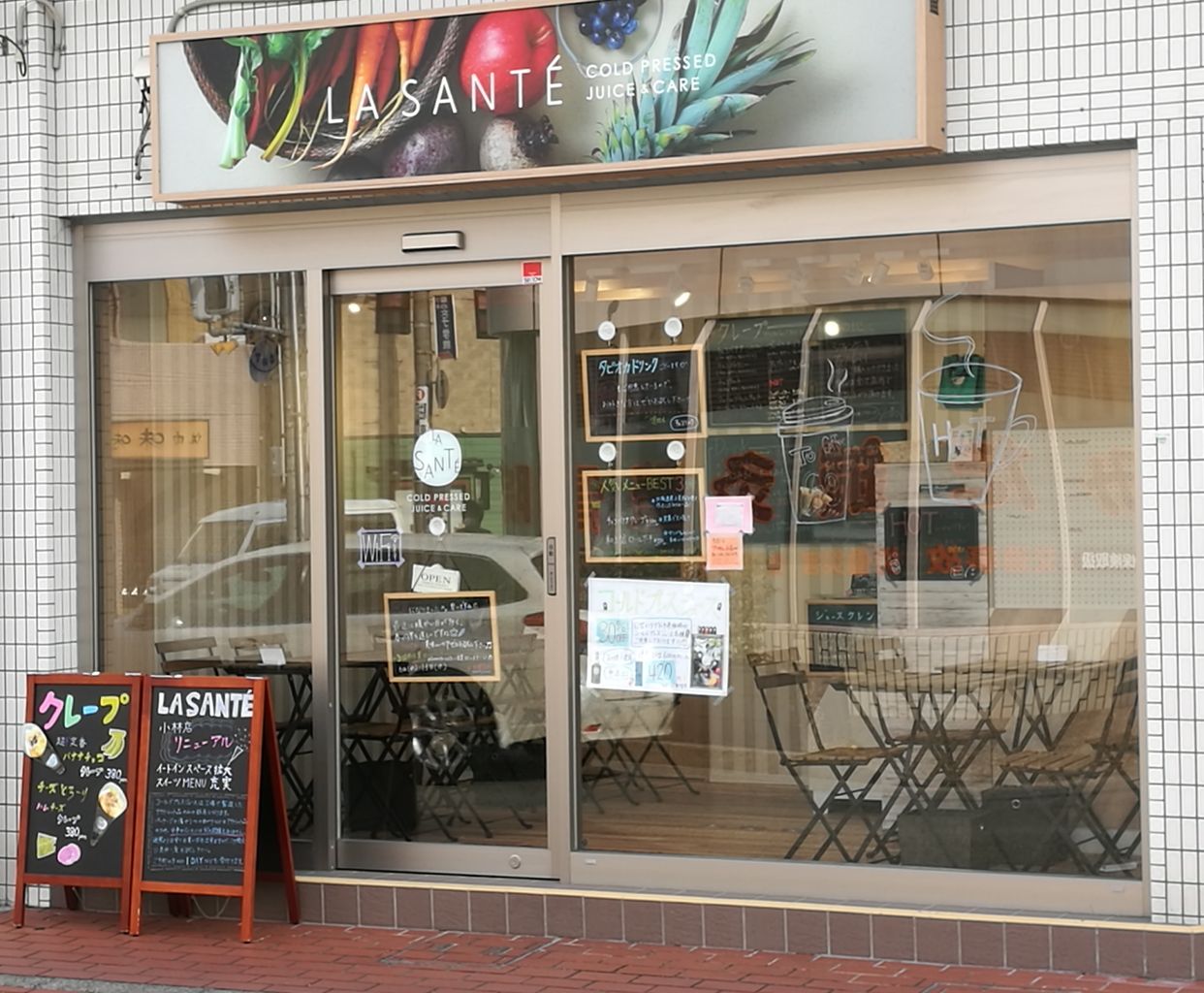昨年春にオープンしたLA SANTE(ラサンテ)小林店は、イズミヤ近く”カーブス”のお隣にあります。筆者はお店の前を何度か通ったことがあり、数枚のPOPが気になっていました。なになに…コールドプレスジュースがアウトレット価格で買えるんだ。お得ですね。スイーツもあってイートインできる、タピオカドリンクもあるの?さらにFREE WiFiもある~ということで、今回初めてお店の中に入ってみました。