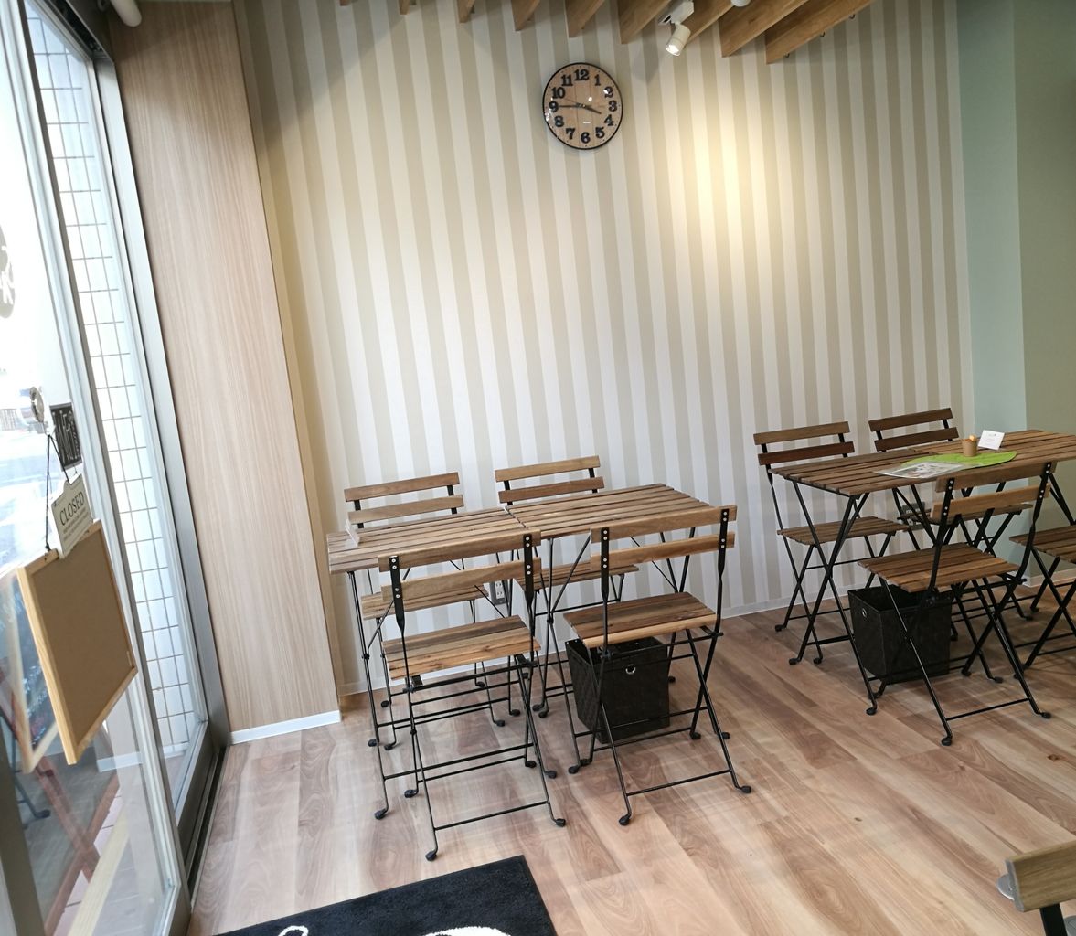 LA SANTE(ラサンテ)小林店は、2人掛けのテーブル席が6つ。スモーキーなペパーミントグリーンi色の壁と、木のあたたかさを感じるテーブルに椅子、床が落ち着いた雰囲気です。そして店頭はガラス張りなのでとても明るかったです。
