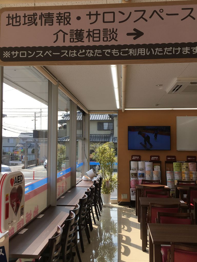 店内レジカウンター横から、「サロンスペースと介護相談」へ抜ける事ができる。ローソンの店員さんに確認したところ、購入した商品を持ち込んで、そこで飲食などをする事が出来きるようだ。スペースには窓際を含めると25席程の椅子があるので、それなりの人数が座る事ができる。店内看板には「どなたでもご利用可能」とあり、本を読むなり、勉強、仕事も出来てしまうかもしれない。ただ、正方形の机があるのだが、やや小さめなので、書類を広げるには窓際がいいだろう。