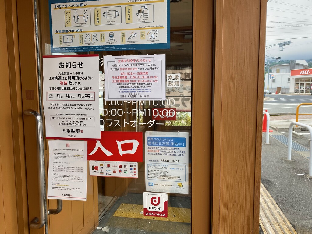 丸亀製麺 中山寺店が店舗改装のため7/4-7/25まで休業中です。