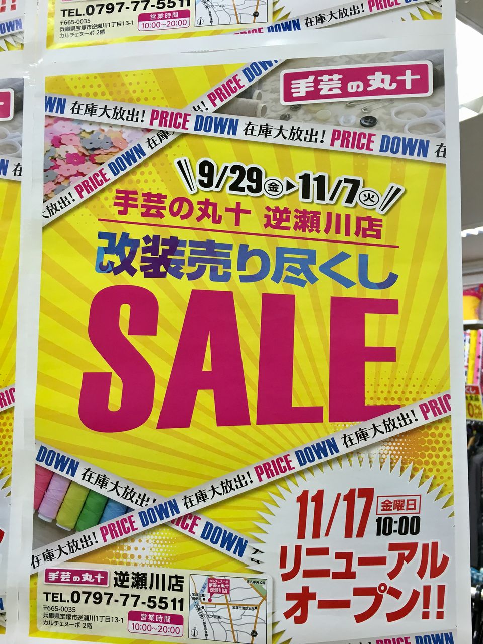 阪急逆瀬川駅前のカルチェヌーボー2階にある「手芸の丸十」 逆瀬川店」が11/17(金)にリニューアルオープンされる。