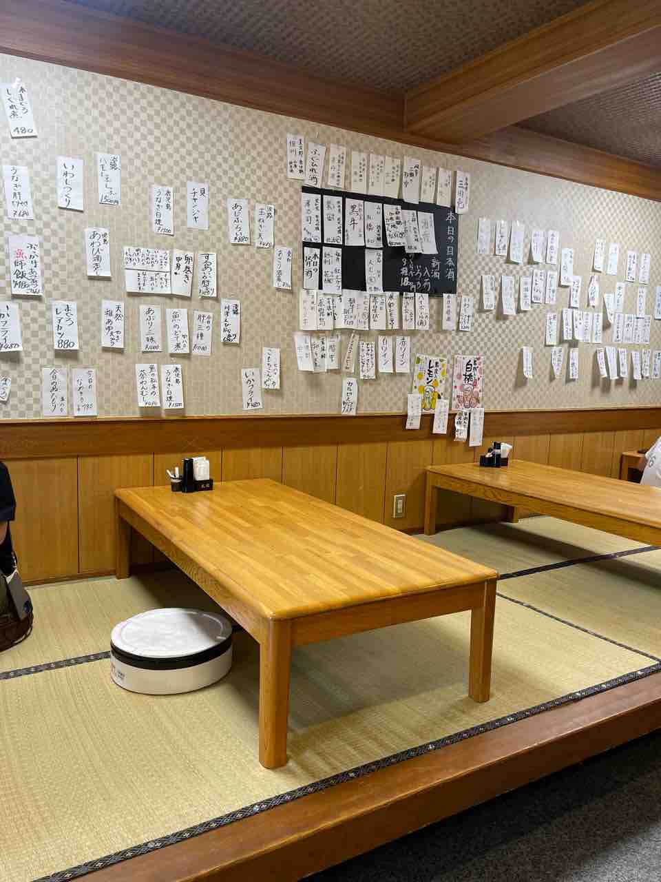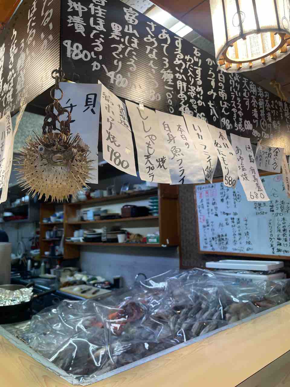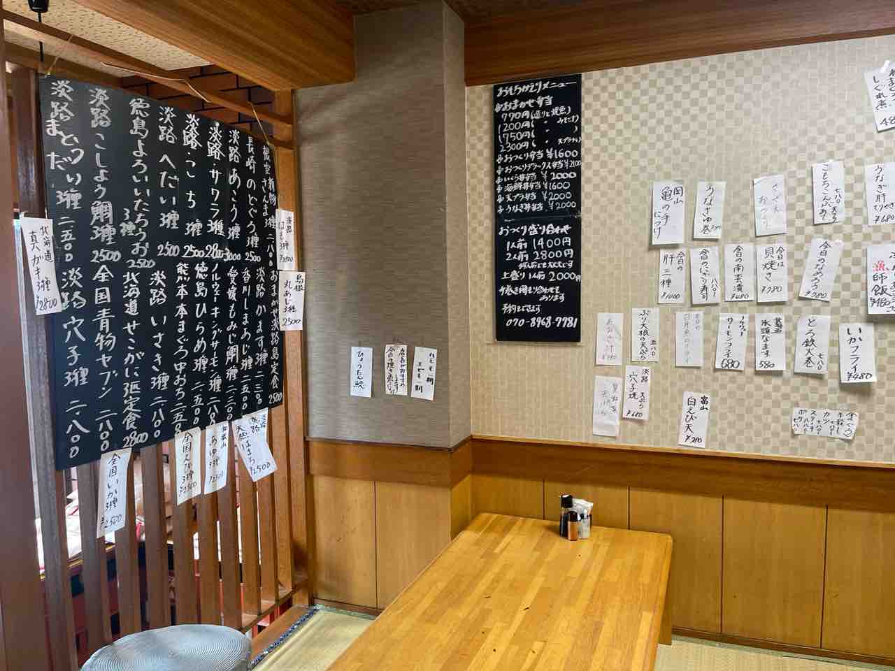 和の設え、メニューの短冊にハリセンボン、いい雰囲気でじわじわテンションが上がります。