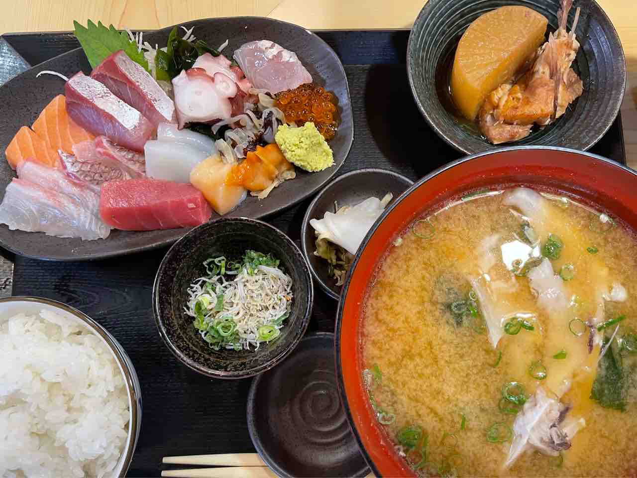 お造りはもちろん、あら汁の大きなお椀にも高揚します。付け合わせは大根のあら炊き、ちりめんじゃこ、自家製のぬか漬け。