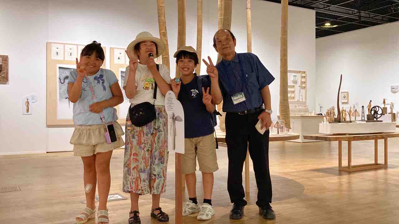 最後に髙田光治先生と記念撮影をした子どもたち。夏休みの宿題のタネも見つけた上、作家の先生に会えて、大満足の笑顔です。
