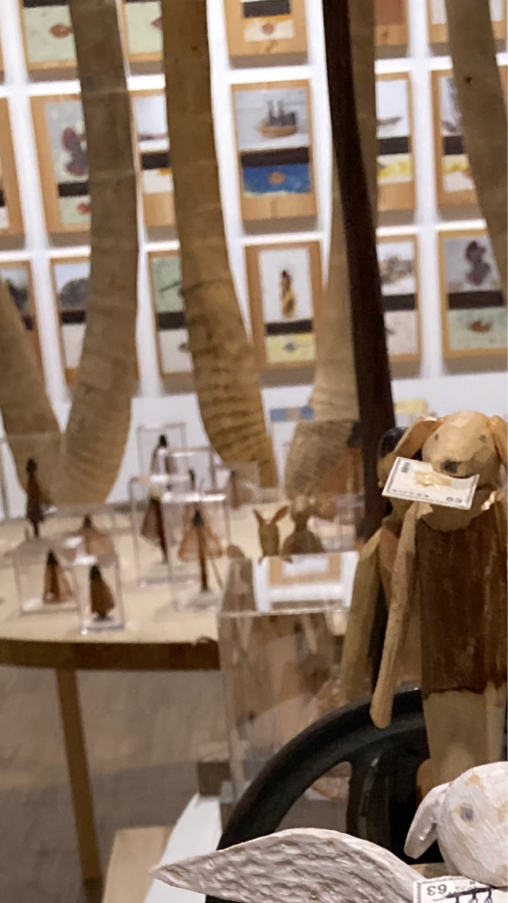 こちらは出口に近い第3室。完全に、髙田先生の作品と違和感なく調和しています。このようなユニークな演出も、髙田先生のアイディアだそうです。「私の個展と言うより、見てくれた人の感想であるこれらの絵と私の作品が一体になった空間が創れたら」と髙田先生。とても優しい髙田先生は、気さくに丁寧にいろいろとお話ししてくださいます。