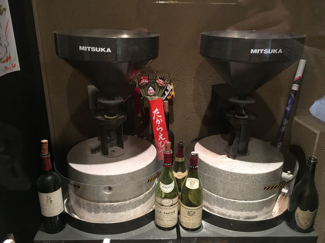 このお店の特徴は、こだわった産地からそばの実をとりよせ、自家製粉する手打ちそば という事。店舗入口すぐ左横にそばの実を挽いている機械を見ることができる。