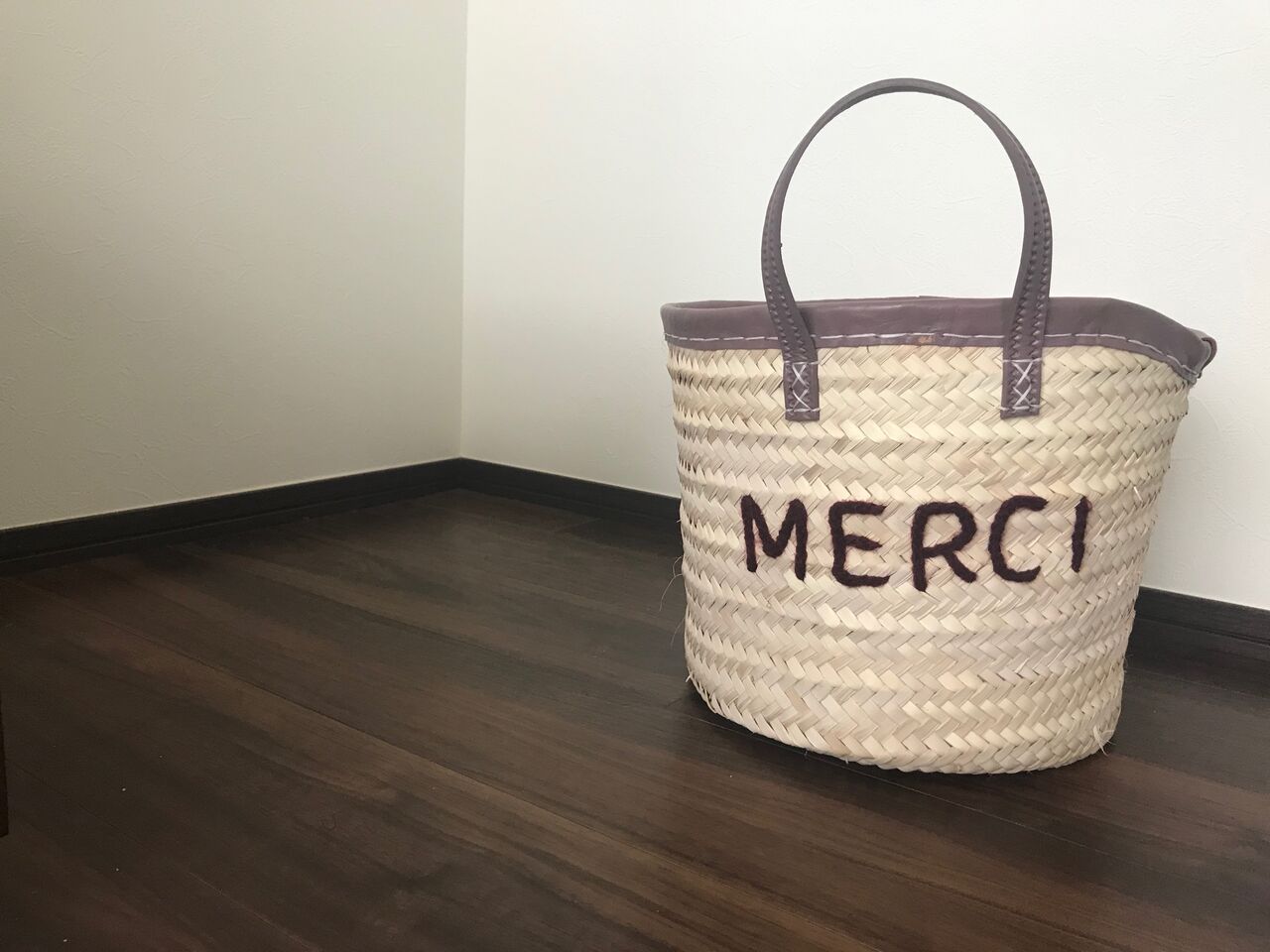 メルシーの刺繍と皮の持ち手が可愛いバスケットはこどものぬいぐるみ収納に。