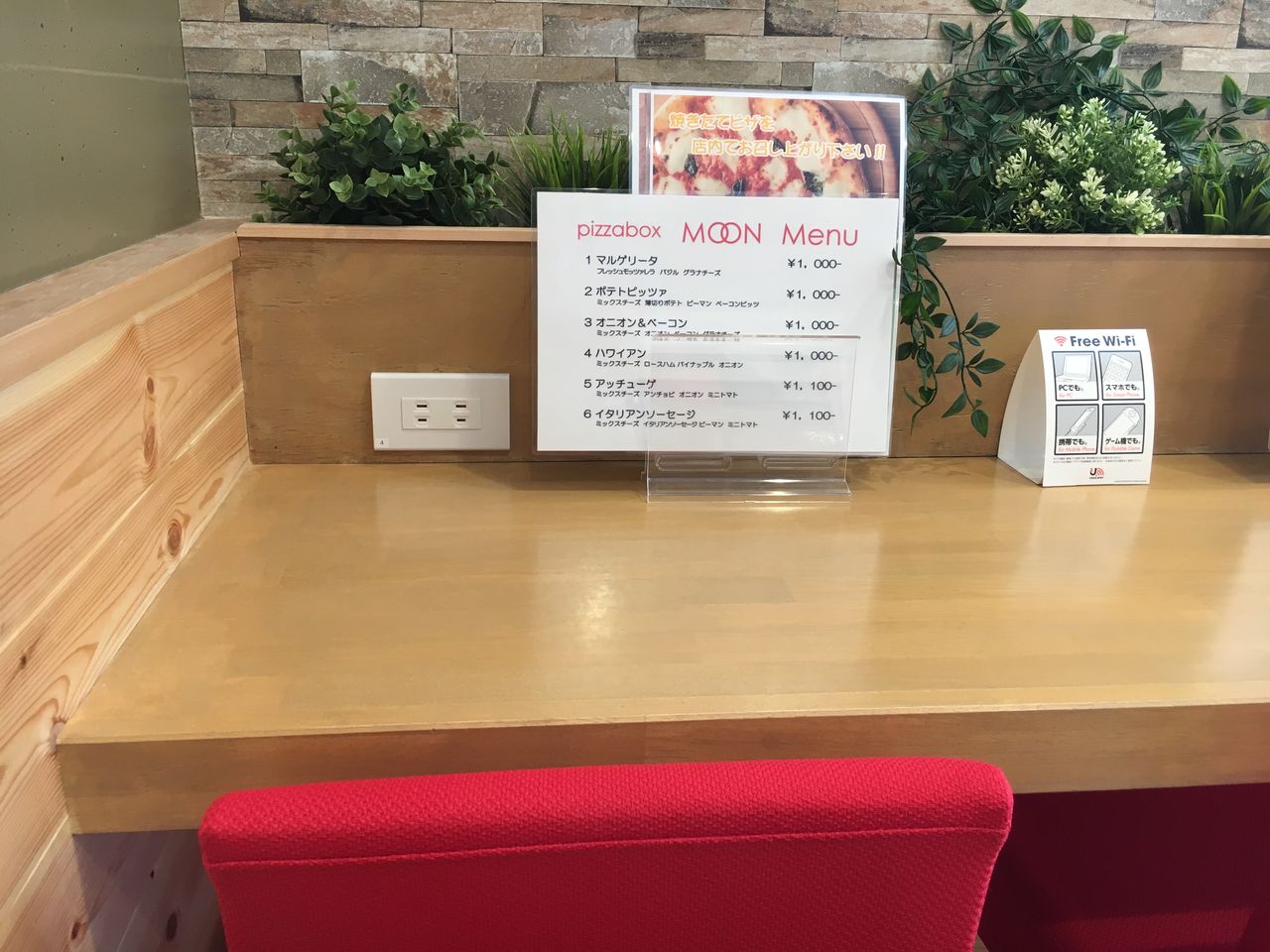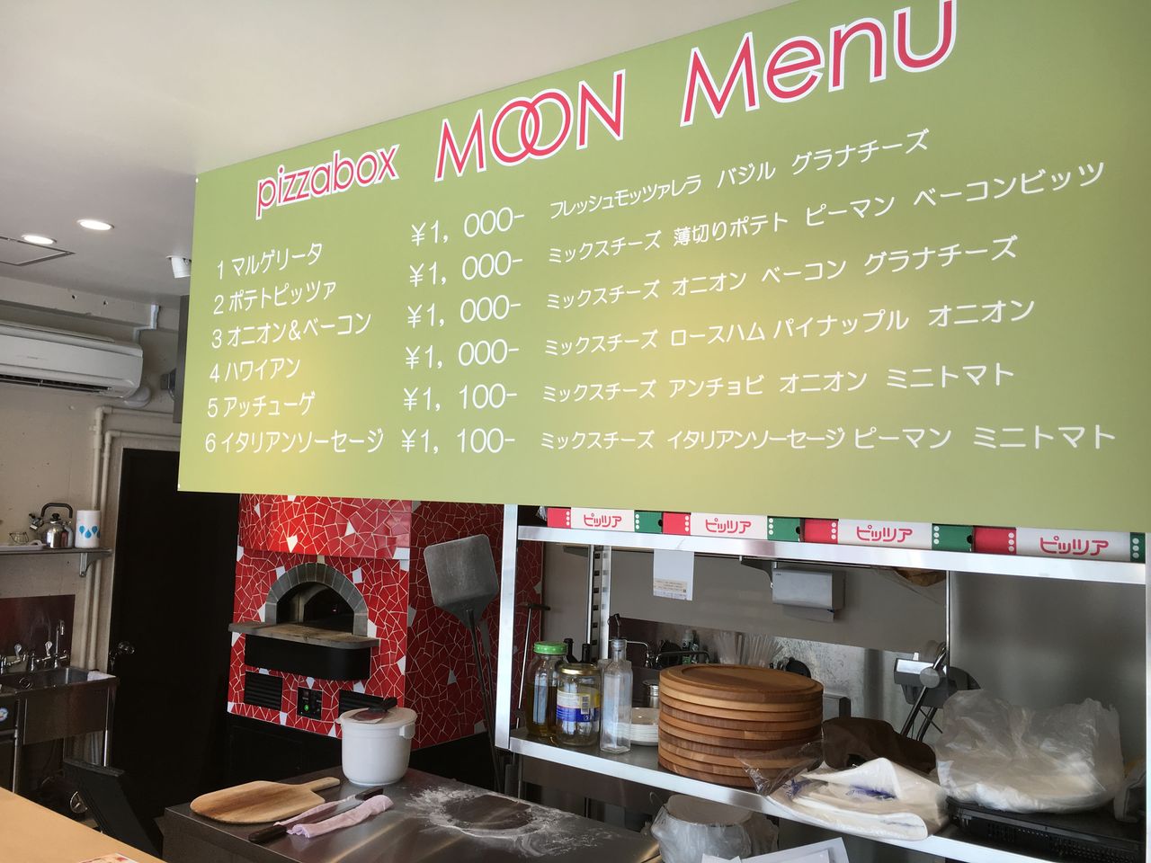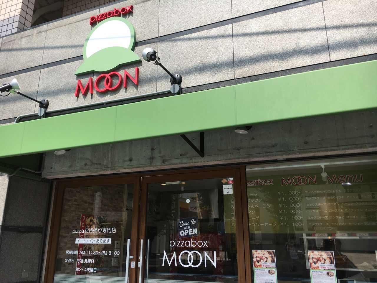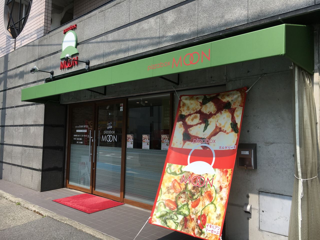 阪急小林にあるpizzabox MOON をしっていますか? 小林駅から徒歩6分。車だと逆瀬川から県道337号線を仁川方面へ走る途中、左側にシンプルでさりげないモスグリーンカラーのピザ店舗「MOON」がある。何度も通る道なのに、これまで気づかなかったが、オープンしてすでに半年が経っているそうだ。ここMOONには、ピザ屋には珍しく、イートインスペースがある。10人程座れるテーブルと椅子があるのだ。軽くピザが食べたくなるシーンでは丁度よく活用できそうだ。