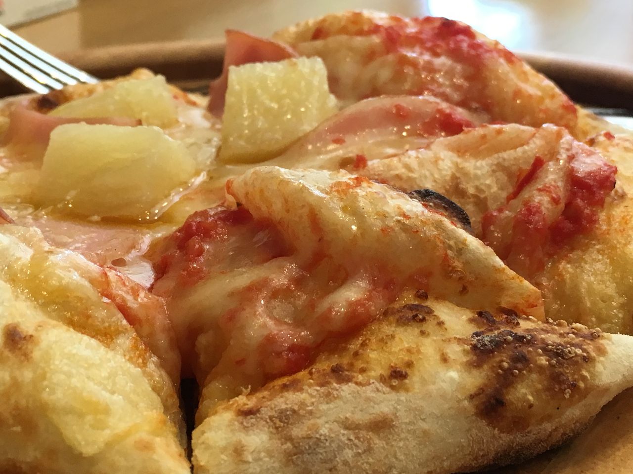 今回注文したのは、Sサイズのピザとドリンクがセットになったイートインメニュー。定番のマルゲリータと、少し変り種のハワイアンを注文。マルゲリータはおなじみ「トマト」「フレッシュモッツァレラ」「バジル」のみで構成されたシンプルなピザだ。シンプルで定番だからこそ、素材の味を大切につくられている。ハワイアンは、「ミックスチーズ」「ロースハム」「パイナップル」で、このパイナップルが甘みを出しているそうだ。
