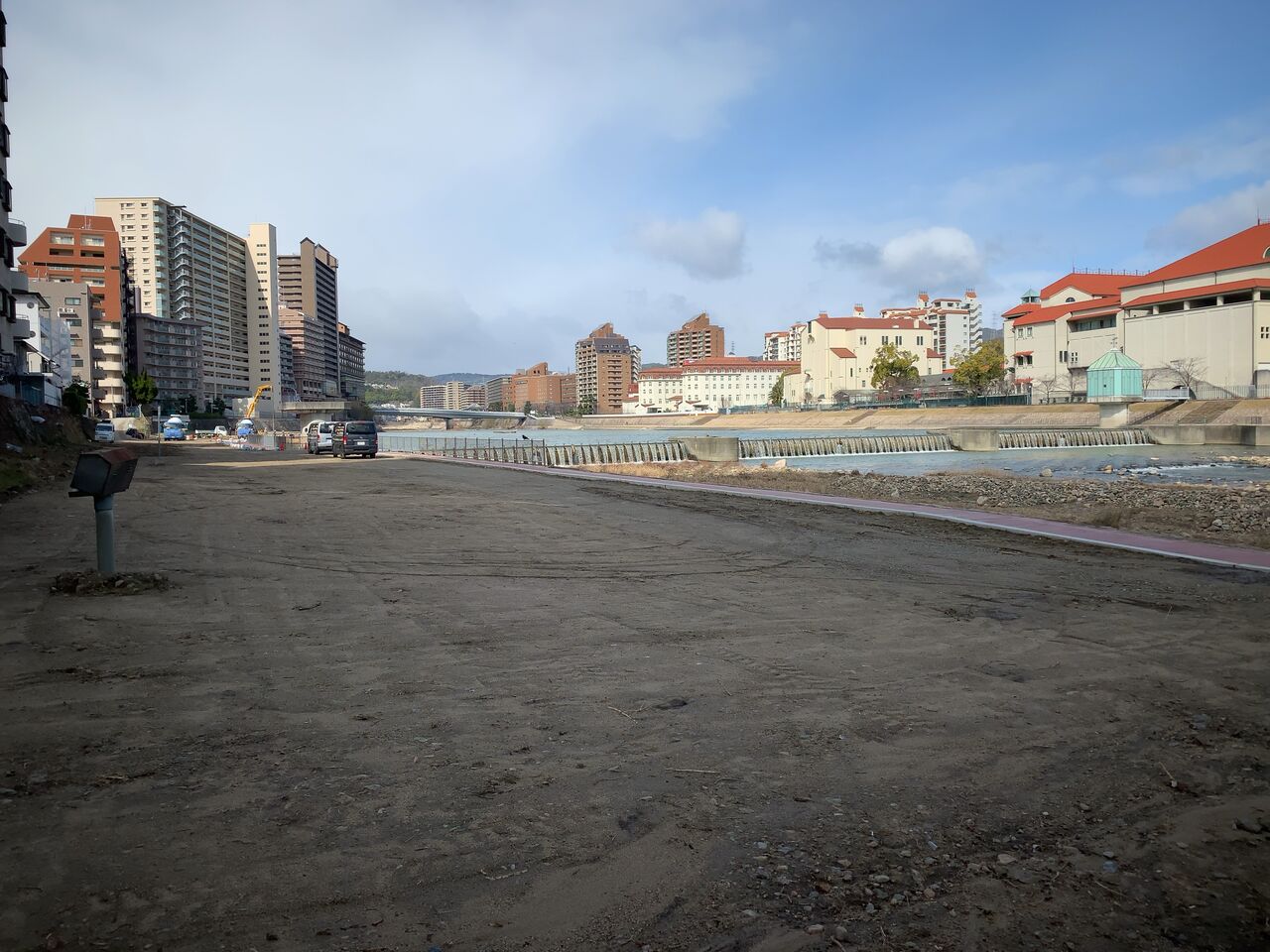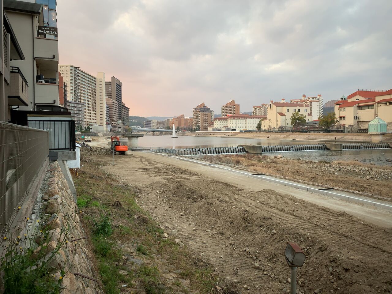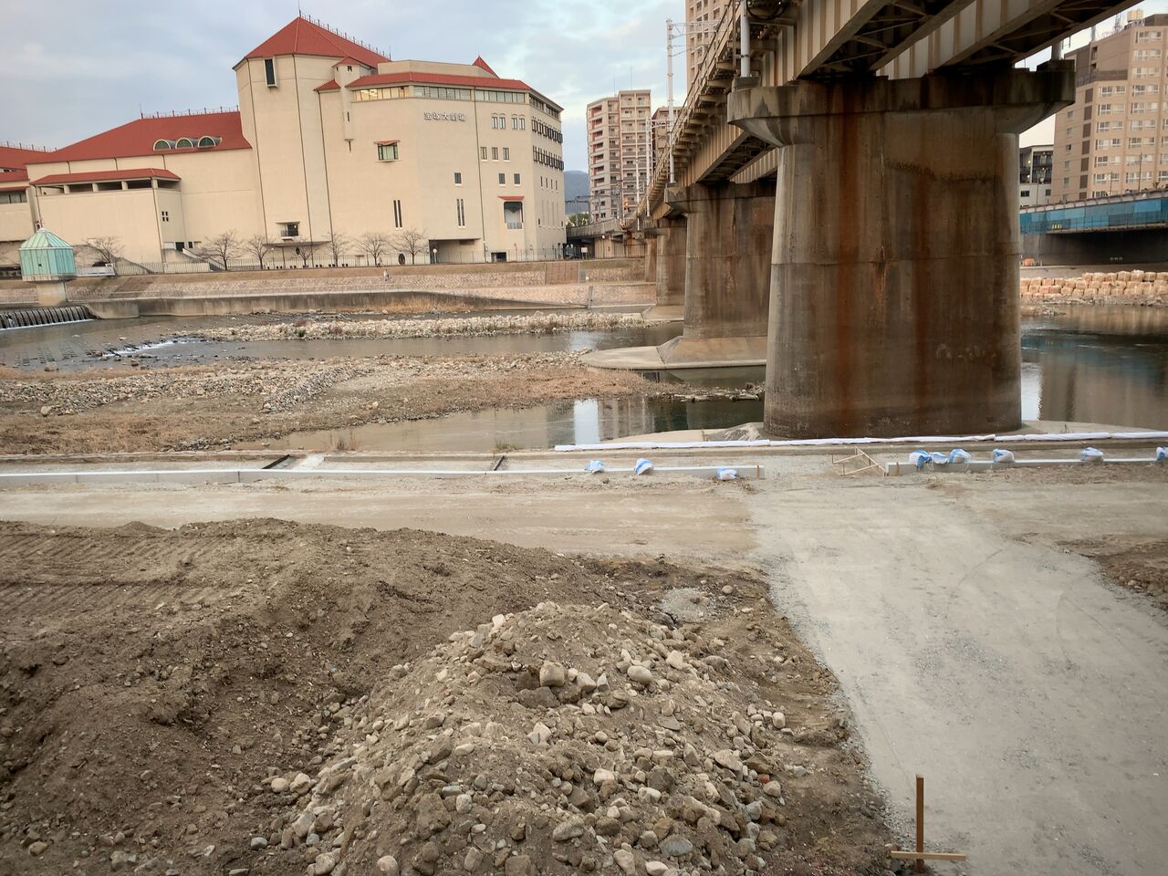 宝塚歌劇前の河川敷とその対岸側の河川敷両方ともが現在工事中です。対岸の方は、これまで長い間荒れていた雑草地帯がついに整備され始めている。北側(宝塚大劇場や宝塚ホテル側)と同様、綺麗に舗装された道にイメージが湧く形になりつつあります。工事の進捗もみるみる進んでいくので、あっと言う間です。完成すれば、綺麗な遊歩道でのんびりできそうです。