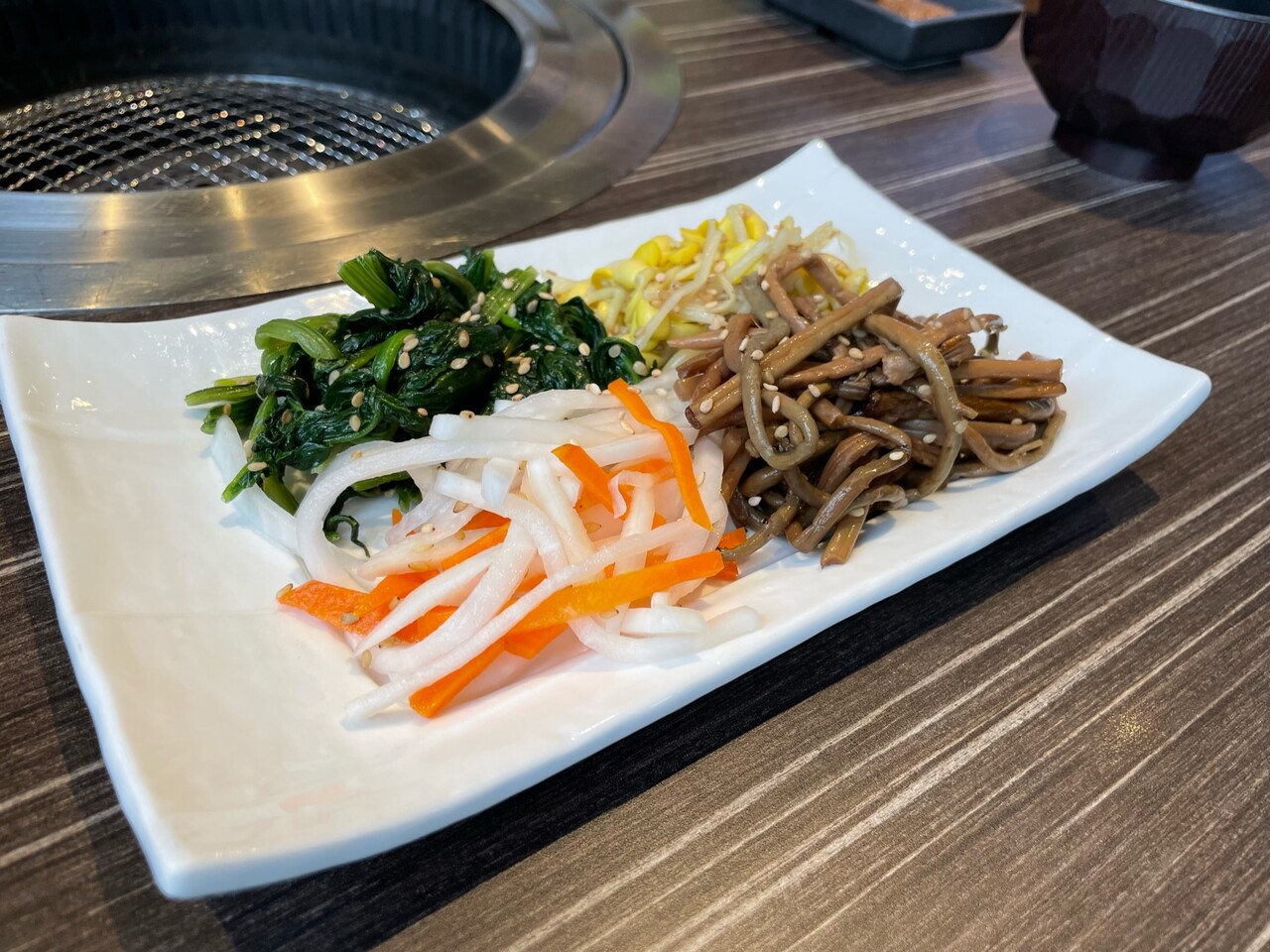 注文したのは、厚切り塩タン、3種盛り、宝塚コロッケ、ナムル盛り合わせ、土日限定ランチご飯セット。