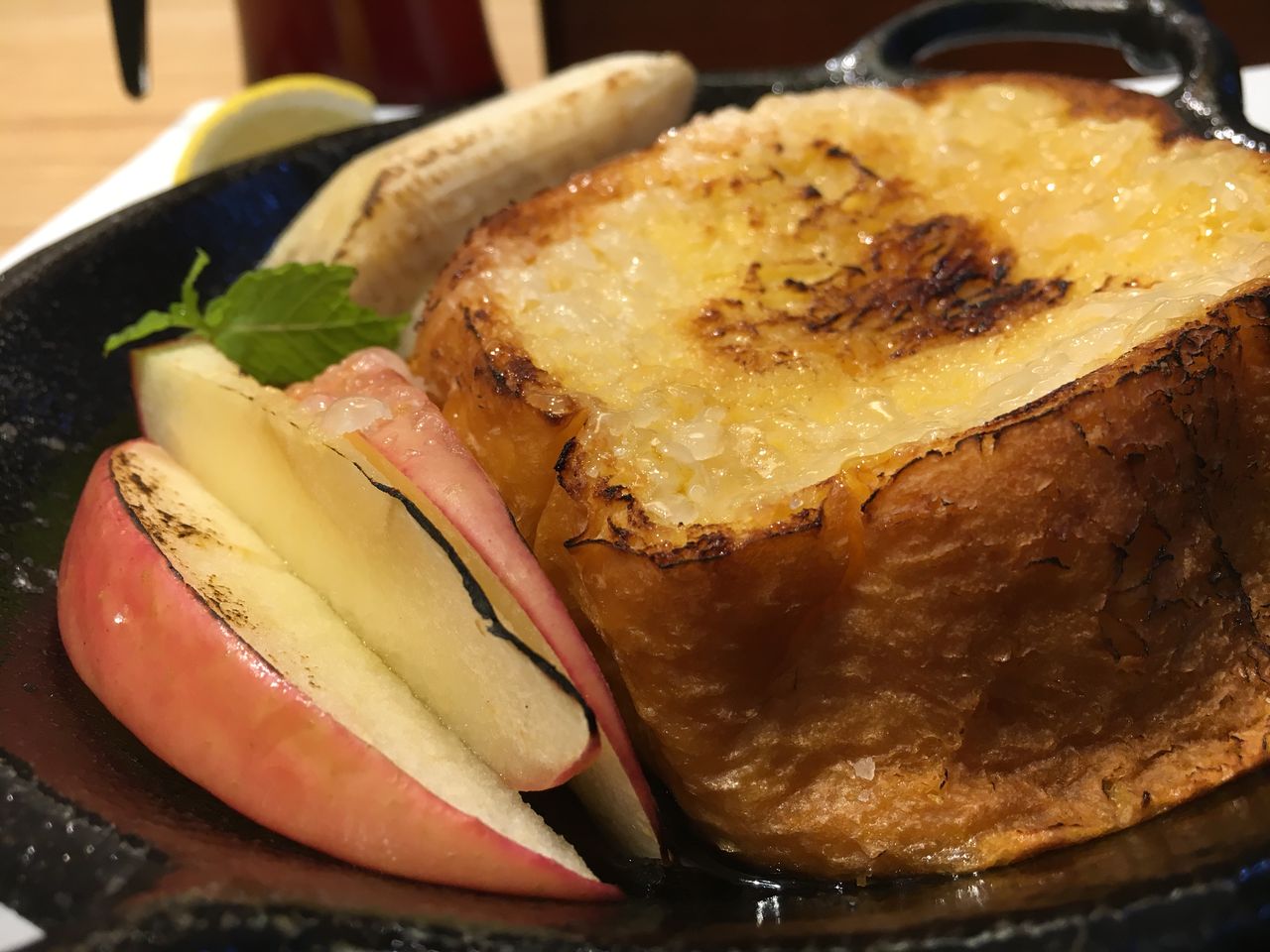 食感と味ですが、両方ともふわふわパンケーキの時の感じとは全く違う感想でした。りんごとバナナが焼いてあります。フレンチトーストにシロップをかけ、トースト、りんご、バナナをすこしづつ切り、トーストの上に載せて、口を頬張り食べました。かなり濃厚な味です。リンゴとバナナが焼かれて増幅した甘さが凄いんです。口の中が濃厚な甘さに反応するあの感覚です。シロップが爽やかにすら感じるほどです。クリーミーなトーストと一緒にりんごとバナナを堪能しました。