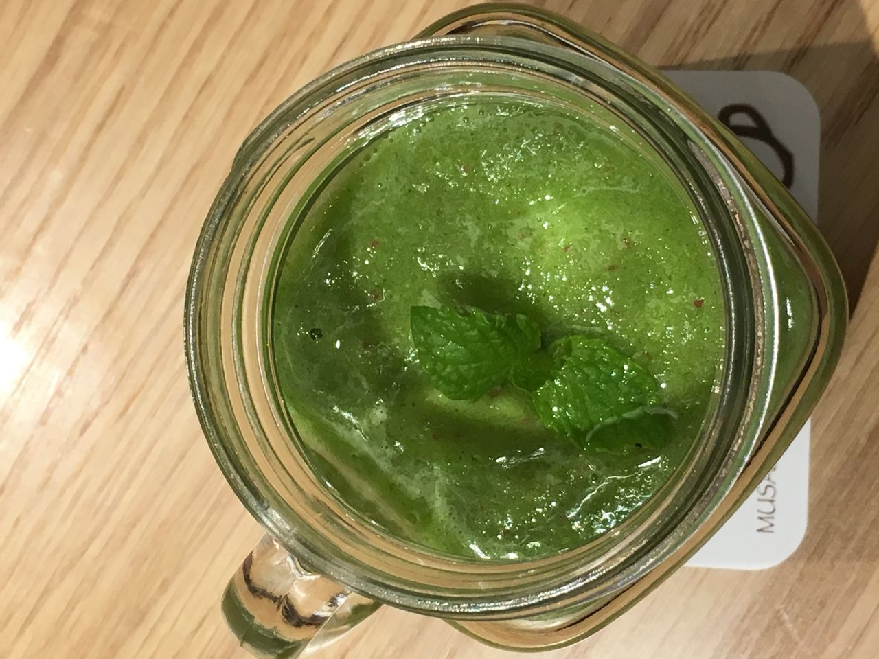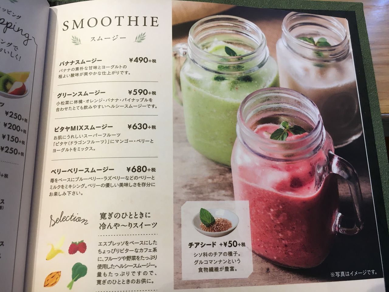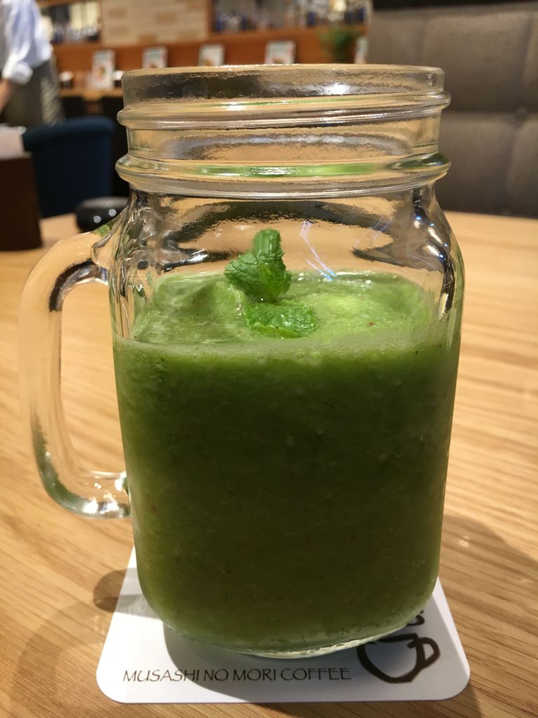 「この中の人気メニューはどれですか」と聞くと「グリーンスムージーが女性にはかなり人気です。」と。早速グリーンスムージーを注文。
