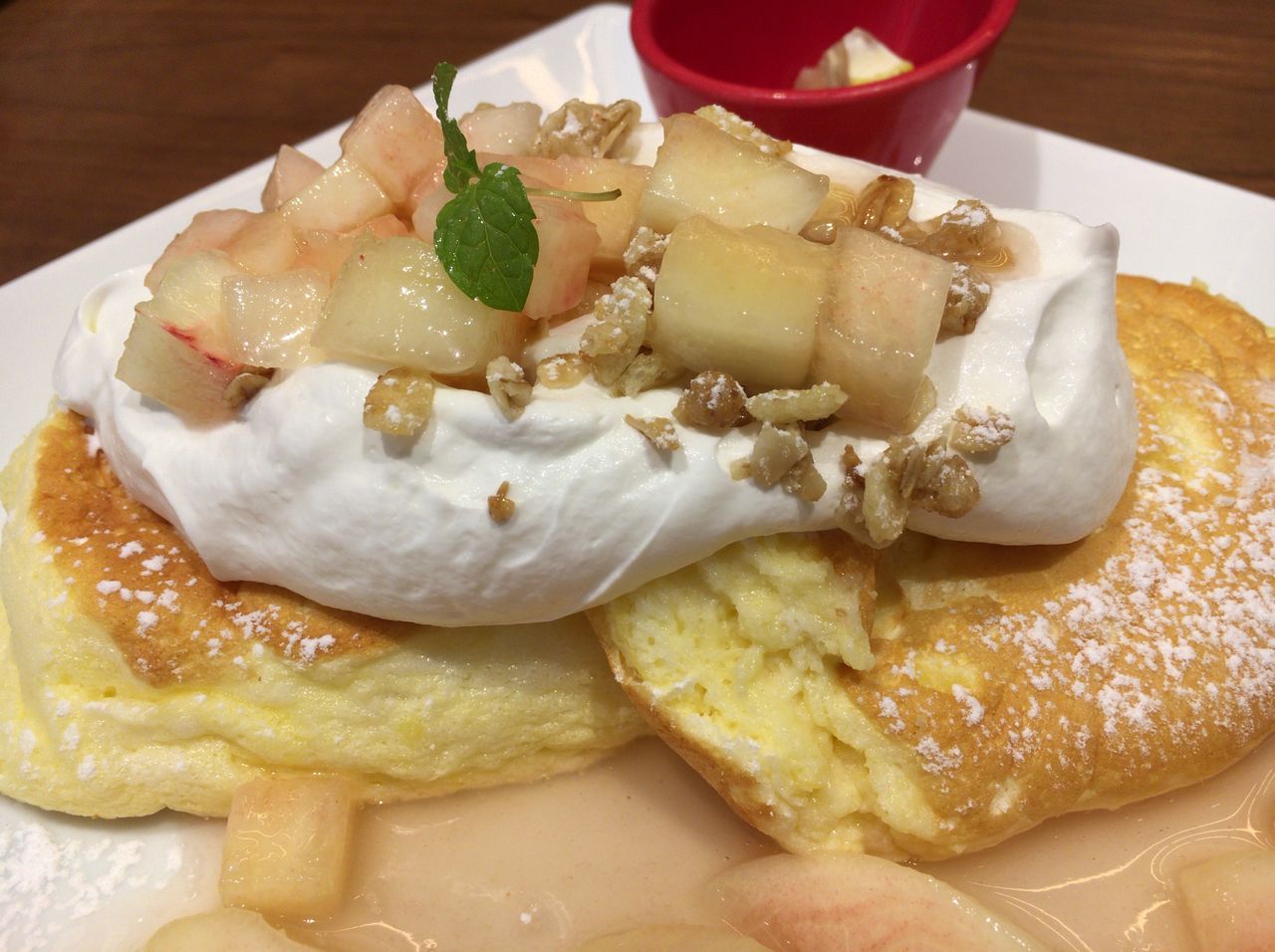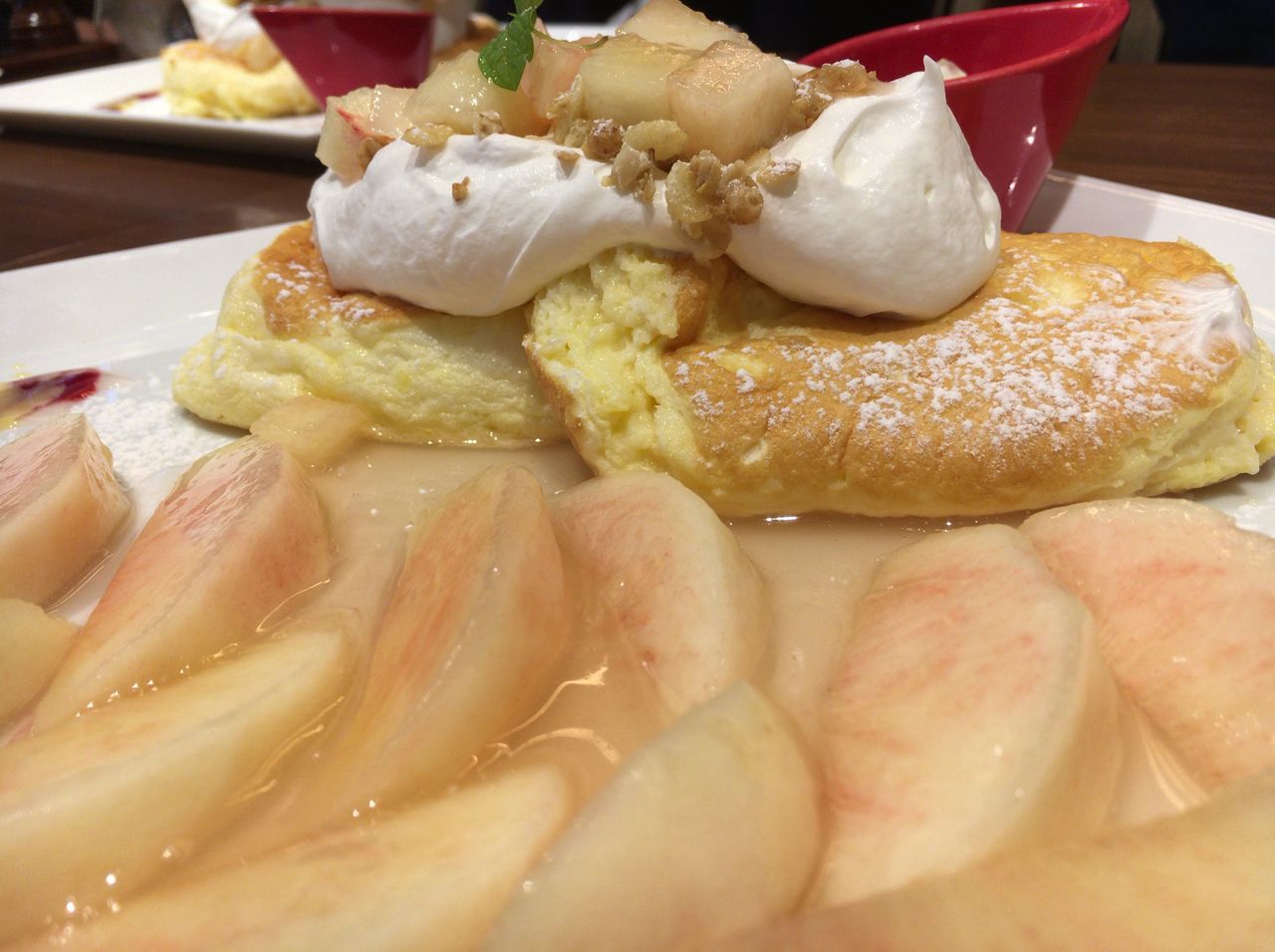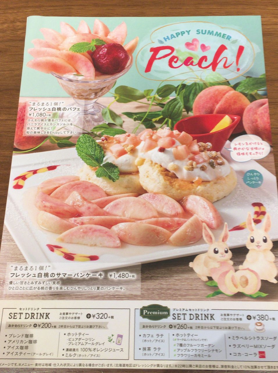 桃まるまる1個!フレッシュ白桃のサマーパンケーキ! 「むさしの森珈琲」ランチタイム行列の理由を探る。