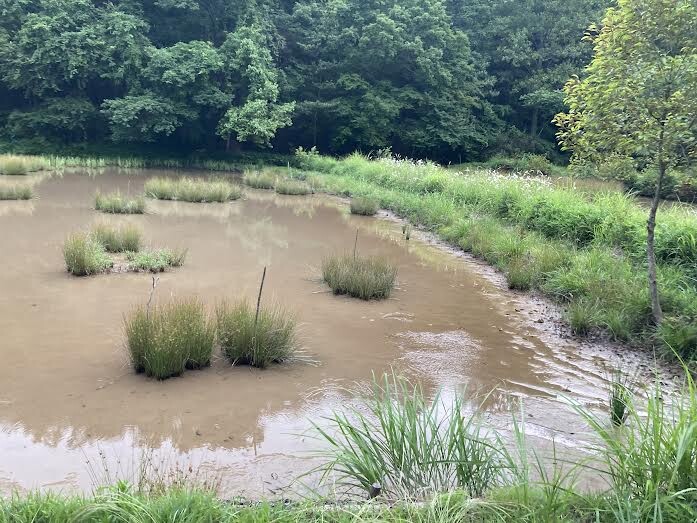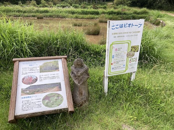 さらに道を奥へ進んで行くと、昔の水田を利用したビオトープ(生物生息空間)が現れました。