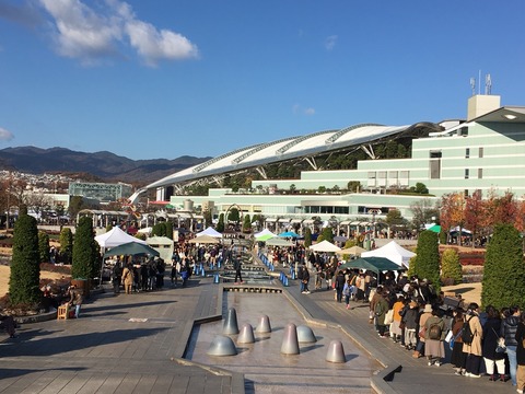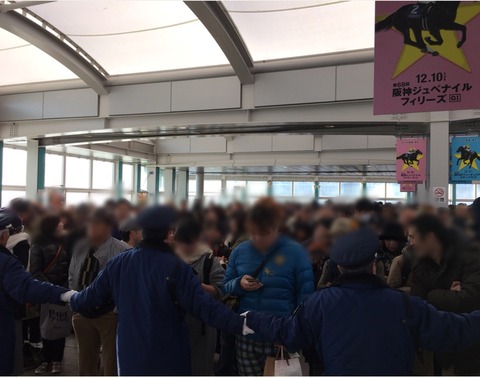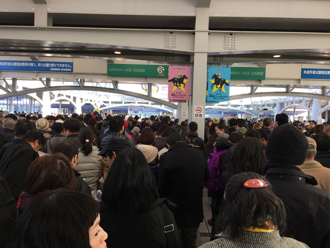 朝9時オープンに向け、張り切って8時半に会場前到着。阪急仁川駅に降りると、すでに老若男女がワンサカ。日頃の競馬開催日と違うのは、おしゃれ女子が約半分。皆足早に競馬場へと向かいます。そして競馬場前に着くと、早くも100メートル以上の列。