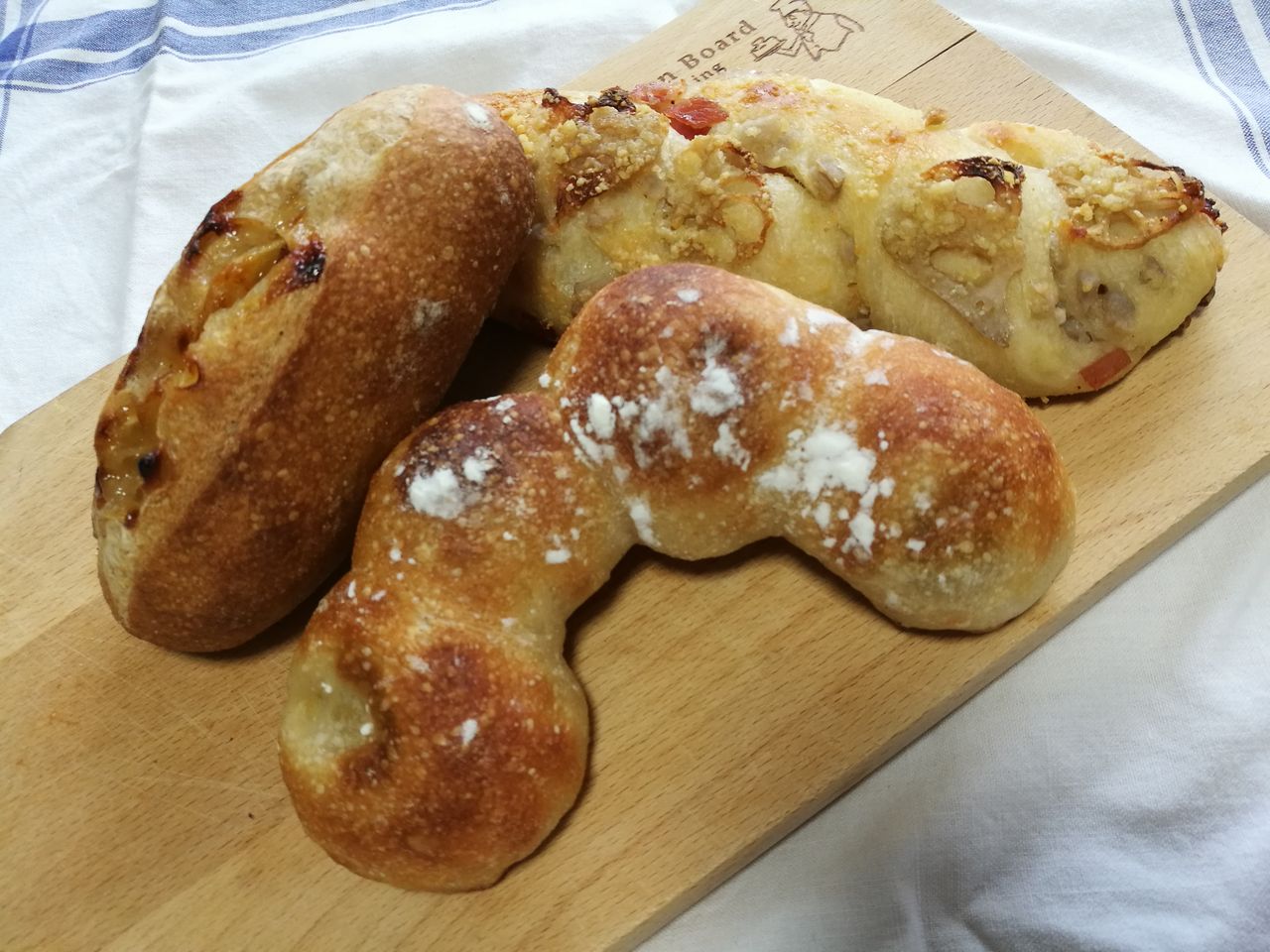 左からカマンベールリンゴ250円、ベーコンレンコンのスティツ230円、下がオリーブのパン180円。