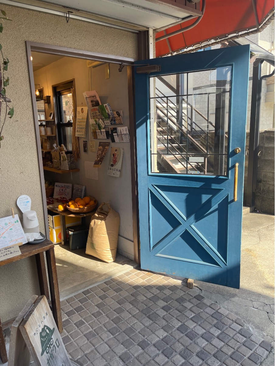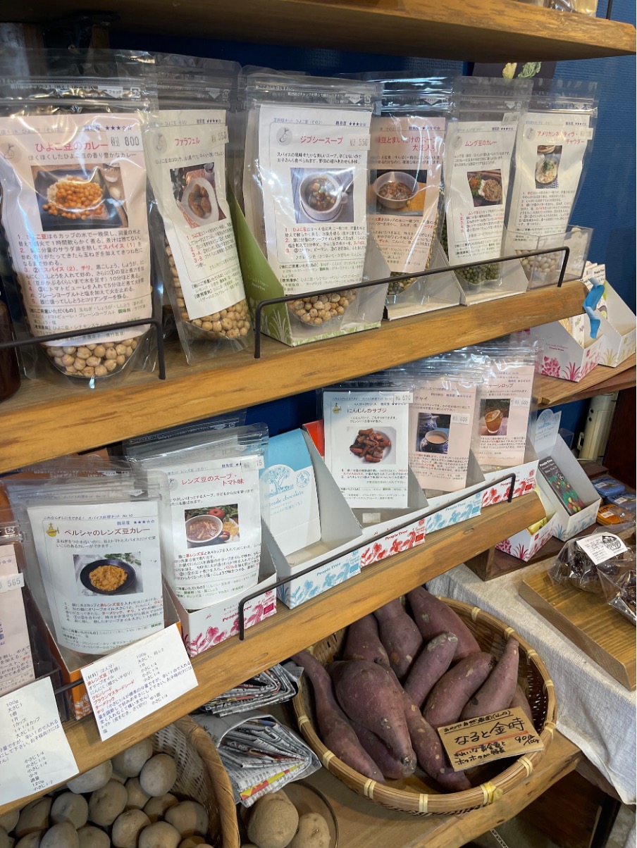 「見るだけでもどうぞ」と出口さん。早速中に入ります。壁の青も梁や土間と相性抜群で、そこに野菜をはじめ色んな食材が色と生命力を添えています。整った店内、ざっくばらんな出口さんの雰囲気、そして元気な旬の野菜、このお店の健康的な感じはこの辺りからきているようです。