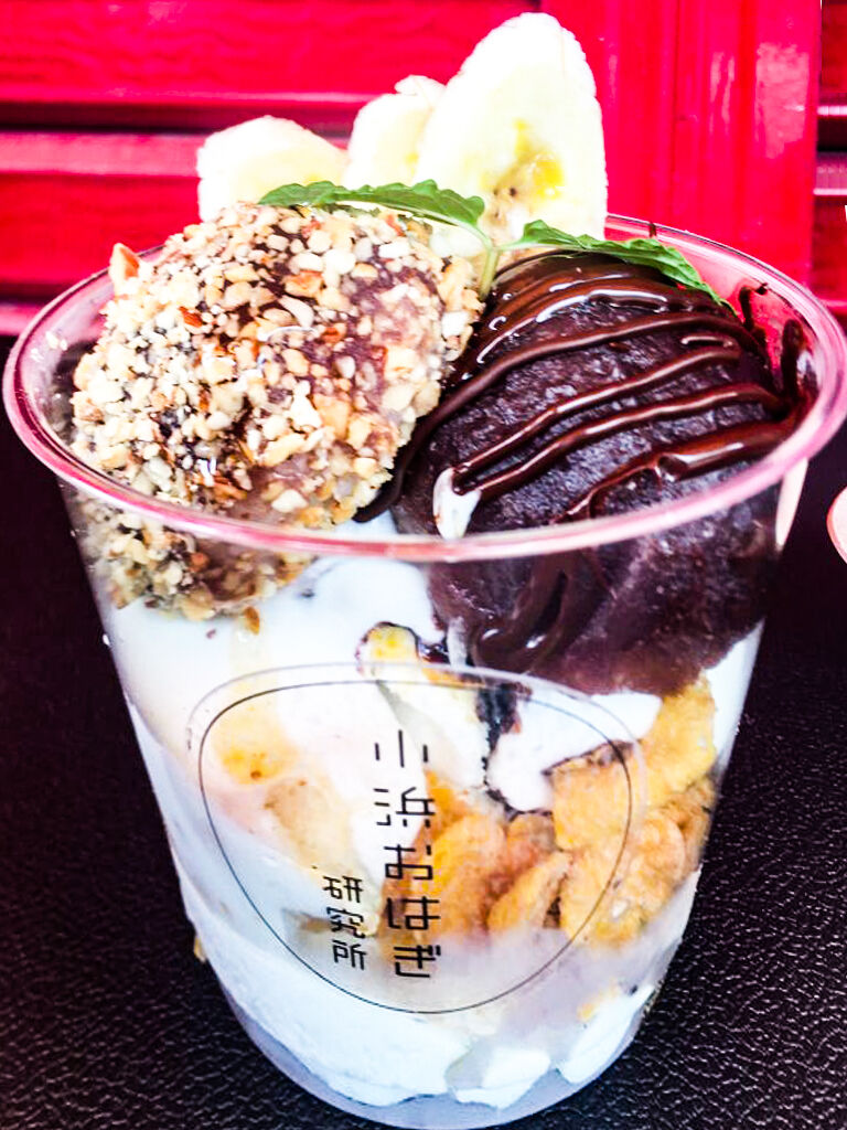 「初代おはぎパフェ」には、ハニーナッツとパフェ用に開発されたというチョコおはぎが乗っています。そこに、生クリーム・コーンフレーク・チョコソース・バニラアイスとバナナが入ったパフェ。お値段480円。おはぎは1つ220円~なので、2つも入っていてこのお値段はお得ですよね!